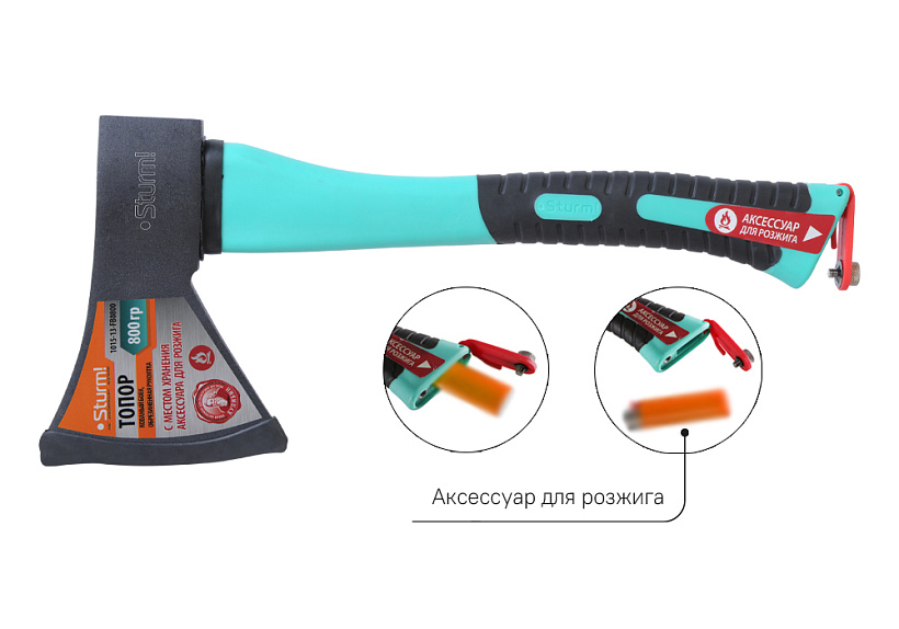 Особенности : Кованый топор, закалённое лезвие антикоррозийное покрытие, обрезиненная фиберглассовая рукоятка аммортизирует удар и создаёт удобный захват |Назначение : Предназначен для колки и рубки дерева |Дополнительные характеристики : Уникальная запатентованная система позволяет хранить аксессуар для розжига прямо в рукоятке, благодаря чему он будет всегда под рукой. Переход от заготовки дров к розжигу стал максимально быстрым. Пенал для хранения закрывается специально разработанной крышкой с пружинящим элементом, который плотно фиксирует аксессуар для розжига. Закрытие крышки осуществляется винтом с широкой рифлёной захватной частью и защитой от выпадения. Кованый топор, закалённое лезвие, антикоррозийное покрытие, обрезиненная фиберглассовая рукоятка амортизирует удар и создаёт удобный захват |Артикул : 1015-13-FB0800 |Производитель : Sturm! |Материал рукоятки : Обрезиненный пластик с фиберглассом |Уникальность : С местом для хранения зажигалки и самой зажигалкой в комплекте. Для оперативного разведения огня после колки дров. |Назначение : Предназначен для колки и рубки дерева |Твёрдость (HRC) : 47-58 |Вес (г) : 800 |Длина рукоятки (мм) : 310 |Покрытие : Антикоррозийная краска |Дополнительные характеристики : Уникальная запатентованная система позволяет хранить аксессуар для розжига прямо в рукоятке, благодаря чему он будет всегда под рукой. Переход от заготовки дров к розжигу стал максимально быстрым. Пенал для хранения закрывается специально разработанной крышкой с пружинящим элементом, который плотно фиксирует аксессуар для розжига. Закрытие крышки осуществляется винтом с широкой рифлёной захватной частью и защитой от выпадения. Кованый топор, закалённое лезвие, антикоррозийное покрытие, обрезиненная фиберглассовая рукоятка амортизирует удар и создаёт удобный захват |Преимущества : Уникальная запатентованная система позволяет хранить зажигалку прямо в рукоятке, благодаря чему она будет всегда под рукой. Переход от заготовки дров к розжигу стал максимально быстрым. Пенал для хранения закрывается специальной крышкой с пружинящим элементом, который плотно фиксирует зажигалку Закрытие крышки осуществляется винтом с широкой рифлёной захватной частью и защитой от выпадения. Фиберглассовая рукоятка топора отлично гасит вибрацию от удара |Габариты в упаковке (ДхШхВ, см) : 36X16.5X2.1 |Основной штрихкод : 4603010089711 |
