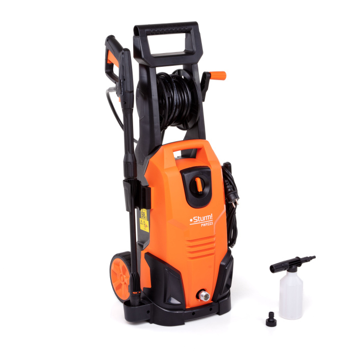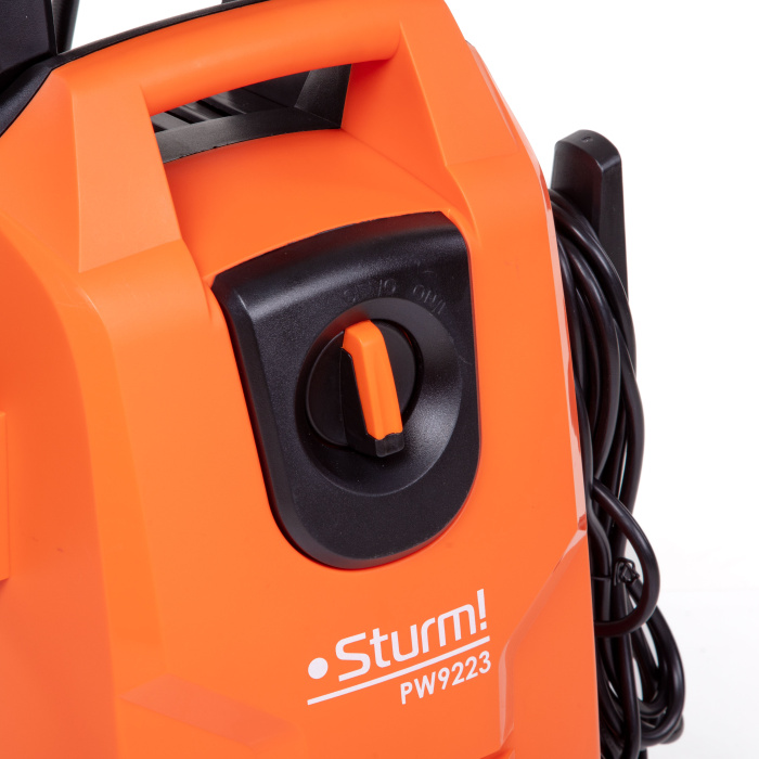 Sturm PW9223 – универсальная мойка высокого давления для бытового использования. Представляет оптимальное сочетание производительности, выверенной эргономики, и широкого функционала. Модель оснащена мощным 2300 Вт электромотором и трёхплунжерной алюминиевой помпой, обеспечивающей производительность в 450 л/час, и высокие показатели по выходному давлению (максимальное давление – 165 бар / рабочее давление – 110 бар) – все это способствует быстрому и эффективному удалению даже самых стойких загрязнений. Входной и выходной патрубки помпы также изготовлены из алюминия, что повышает механическую прочность изделия. Важная особенность мойки Sturm PW9223 – наличие функции самовсасывания, позволяющей полноценную эксплуатацию устройства даже при отсутствии условий для подключения к стационарному водопроводу, используя для забора открытые источники: ведро, бочку или бак. Модель комплектуется длинным семиметровым шлангом высокого давления, обеспечивающим значительную рабочую площадь: с его помощью можно свободно мыть легковой автомобиль, очищать крыши дачных построек и другие объекты без необходимости передвигать мойку с места на место. Для защиты шланга от нежелательных перегибов предусмотрена штатная катушка для его намотки. Легкости подключения шланга и оснастки способствуют специальные быстросъемные соединения QuickConnect. Дополнительную функциональность обеспечивает наличие установленного в задней части корпуса бачка для моющего средства, благодаря которому пользователь получает возможность предварительной обработки моющим составом загрязненной области, не прибегая к использованию дополнительного оборудования. Безопасную, энергосберегающую и долговечную работу мойки гарантируют встроенная термозащита и автоматическая система с микровыключателем мгновенной остановки двигателя Total Stop. Удобство перемещения достигается благодаря большим транспортировочным колесам.