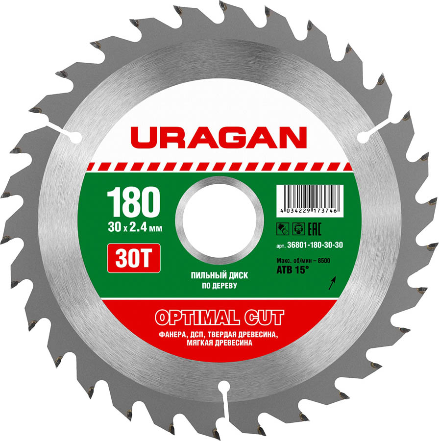 URAGAN Ø 180 x 30 мм, 30T, диск пильный по дереву 36801-180-30-30