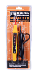 Тестер напряжения 6890-63 (8 в 1) для ступенчатой индикации напряжения электропитания и химических источников питания типа AA, AAA, C, D. Он отличается неоновой дискретной индикацией напряжения 150-500 В, качественной сборкой и надежностью. Стержень цифровой отвертки-индикатора очень прочен, что гарантирует долговечность инструмента.Принцип действия тестера очень прост, так как все элементы тестера составляют простую последовательную электрическую сеть с понижающими резисторами и тремя неоновыми лампами. Для проверки наличия напряжения в сети, необходимо коснуться жалом отвертки-тестера оголенного проводника и вторым щупом коснуться второго проводника. Электрический ток проходит по жалу тестера, через резисторы номиналом не менее 0,5 мОм, понижающий ток до безопасного уровня и доходит до одного из контактов неоновой лампочки. Второй контакт лампочки замыкается пользователем вторым щупом. Лампа загорится, при условии, что в сети присутствует напряжение. Чем выше замеряемое напряжение, тем больше лампочек загорается.Параметры:Светодиодная дискретная индикация величины напряжения постоянного тока с пороговыми значениями: 6 В, 12 В, 24 В, 50 В,110 В, 220 В, 380 В, Светодиодная дискретная индикация действующего значения напряжения переменного тока с пороговыми значениями: 6 В, 12 В, 24 В, 50 В ,110 В, 220 В, 380 В, Максимально допустимое значение напряжения: 400 В, Максимальный переменный входной ток на 380 В: 52 мА, Частота переменного напряжения: 50-500 Гц, Измерение – контактное, Число щупов – 2 шт.