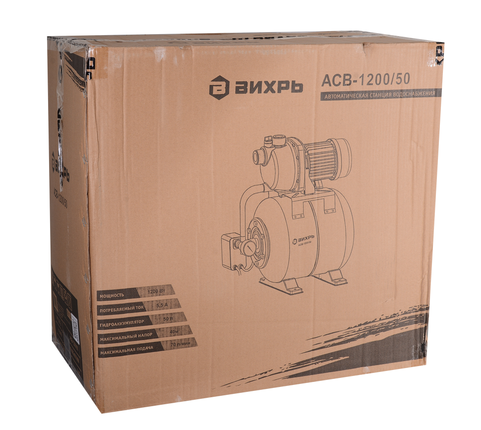 Модель мощной автономной станции водоснабжения Вихрь АСВ 1200/50 состоит из поверхностного электронасоса, гидроаккумулятора и реле давления, объединённых в единую конструкцию. Мощность насоса составляет 1.2 кВт. Объём гидроаккумулятора – 50л. Станция способна перекачивать до 70 л/ч, создавая напор до 40м. Напор в системе поддерживается автоматически. При понижении давления до 1.5 бар реле включает агрегат, а при повышении до 3.0 бар – выключает.Модель Вихрь АСВ 1200/50 рассчитана на 20 включений в час. Температура перекачиваемой воды может быть в пределах +1 - +50°С при концентрации твёрдых частиц до 150 г/м³. Электропитание автономной насосной станции осуществляется от сети 220 В, 50 Гц с допустимыми колебаниями напряжения до 10%.Модель Вихрь АСВ-1200/50 может обеспечивать снабжение водой до четырех открытых водозаборных точек, при заборе с глубины до 5м и при длине магистрали до 5м. При заборе с глубины до 6м и при длине магистрали до 5м станция обеспечит водоснабжение до трех открытых водозаборных точек. При заборе с глубины до 7м и при длине магистрали до 5м станция обеспечит водоснабжение до двух одновременно открытых точек.Внимание. Работа станции без воды запрещена.