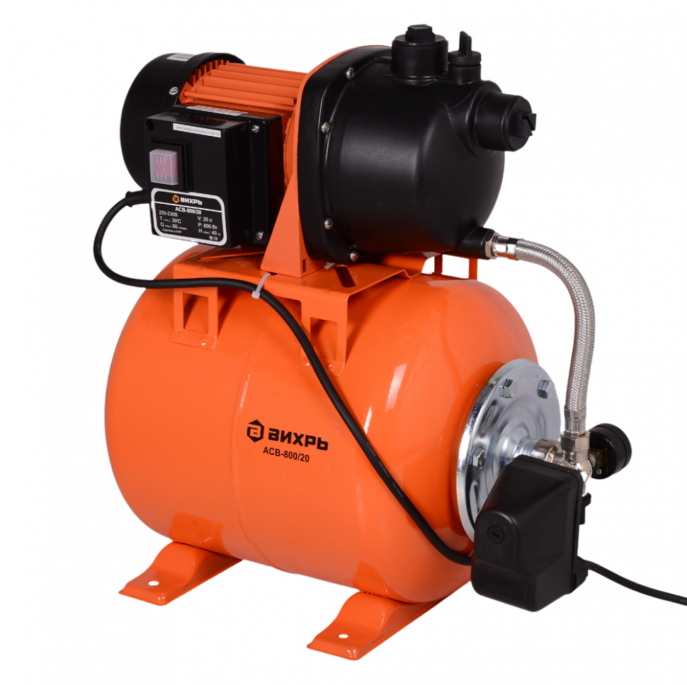 Автономная станция водоснабжения – беспроигрышный вариант для организации подачи воды в загородный дом, коттедж или на ферму. Во-первых, установив Вихрь АСВ 800/20, можно получить полностью автономную систему, которая сама включается и выключается, а также поддерживает необходимое давление. Во-вторых, насос в составе станции служит в разы дольше, благодаря наличию гидроаккумулятора.Кроме насоса, который работает на асинхронном однофазном электродвигателе, конструкция станции предполагает наличие манометра и реле, а также гидроаккумулятора. В последнем находится вода под давлением. Это позволяет постепенно отдавать ее в систему, не запуская насос каждый раз.Особенности Вихрь АСВ 800/20, которые важно узнать перед покупкой:Мощность двигателя составляет 0,8 кВт.Максимальный напор – 40 м.Емкость бака гидроаккумулятора составляет 20 л.Функция самовсасывания позволяет извлекать воду из колодцев и скважин глубиной до 9 м.На баке расположены ножки, которые обеспечивают устойчивость станции.Расположенные в верхней части устройства реле и манометр легко поддаются обслуживанию.Максимально допустимое количество включений в час составляет 20 раз.Устройство работает с чистой водой. Количество твердых включений должно быть не более 150 г/м³.Система тепловой защиты предохраняет насосное оборудование от перегрева.Модель Вихрь АСВ-800/20 может обеспечивать снабжение водой до трех открытых водозаборных точек, при заборе с глубины до 5м и при длине магистрали до 5м. При заборе с глубины до 6м и при длине магистрали до 5м водоснабжение будет обеспечено для двух открытых водозаборных точек. При заборе с глубины до 7м и при длине магистрали до 5м станция обеспечит водоснабжение для одной точки.Автономная станция водоснабжения позволяет рационально организовать систему водоснабжения загородного дома или дачи. Все необходимые компоненты для автоматической работы Вихрь АСВ 800/20 уже имеет.