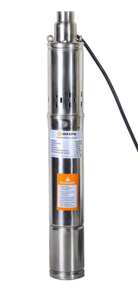 Скважинный насос Вихрь СН-100В/3 представляет собой погружное устройство, предназначенное для подачи воды. Он способен поднять ее с внушительной глубины. Скважинный насос поможет перекачать чистую воду из колодцев, открытых водоемов, скважин диаметром от 85 мм.Отличительные особенности модели, которые важно знать перед покупкой:Вихрь СН-100В/3 – винтовая разновидность насосов. Внутри конструкции расположен металлический полированный винт. Он вращается в резиновом корпусе. Преимущество такой конструкции – невысокая стоимость.Насос способен обеспечить равномерную подачу воды.Мощность устройства составляет 1100 Вт.Модель способна поднять воду на высоту до 100 м.Производительность 35 л/мин.Погрузить устройство в воду можно до 35 м в глубину.Корпус выполнен из нержавеющей стали, а насосная часть из хрома и стали. Диаметр насоса - 75 мм.Устройство способно перекачивать незагрязненную воду. В ней не должно быть примесей песка более 50 г/м³.Погружной скважинный насос Вихрь СН-100В/3 подойдет для перемещения чистой воды из открытых водоемов, колодцев, емкостей, скважин глубиной не более 100 м. Эффективная система защиты от перегрева существенно продлевает срок службы и без того долговечного устройства.