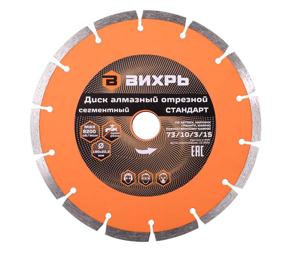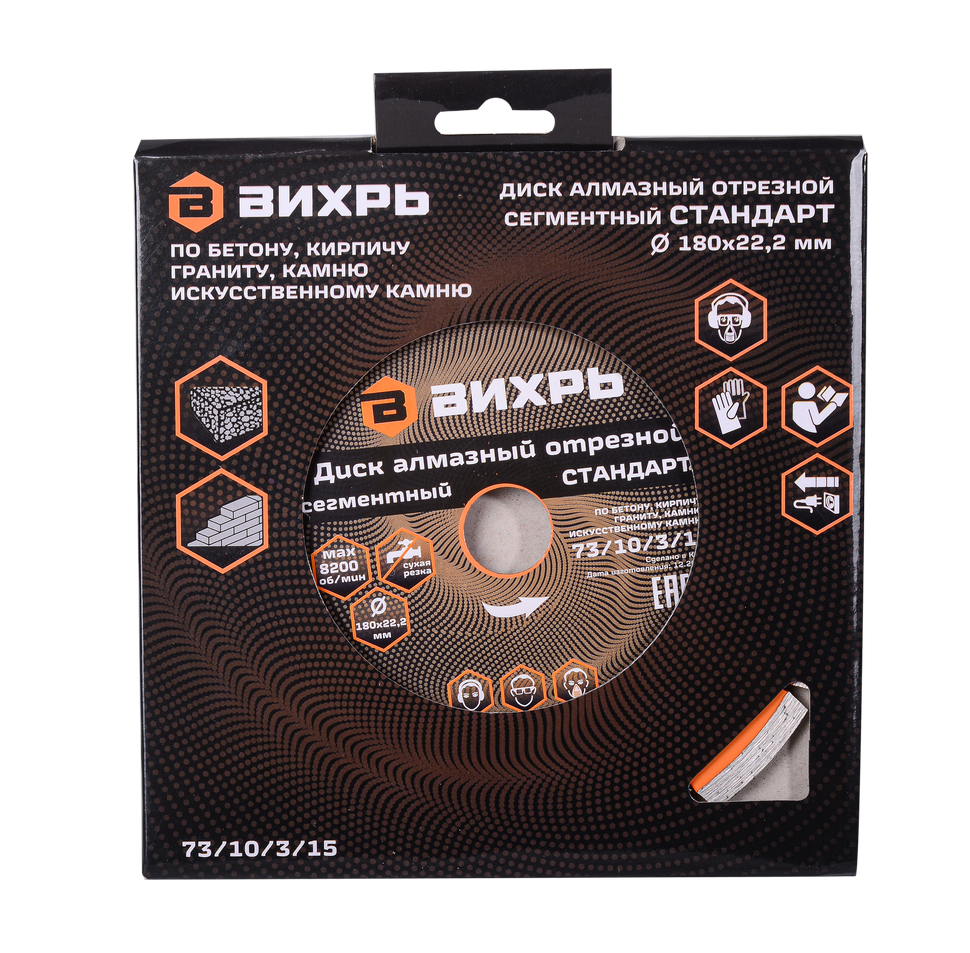 Диск алмазный отрезной сегментный СТАНДАРТ, 180 х 22,2 мм, сухая резка Вихрь