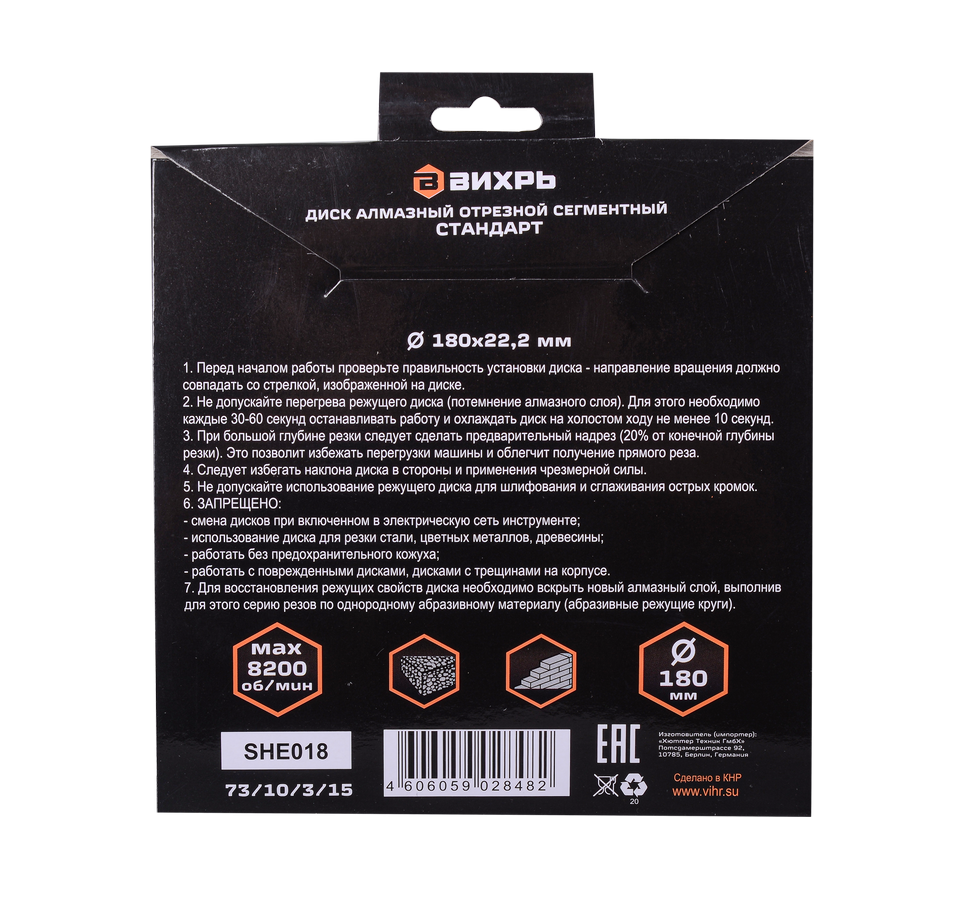 Вид : Алмазный сегментированный |Тип : По бетону, граниту, кирпичу, камню |Диаметр, мм : 180 |Посадочный диаметр, мм : 22,2/20 |Тип реза : Сухой |Бренд : Вихрь |Вес, кг : 0.354 кг |Габариты упаковки : 0.064 × 0.064 × 0.064 м |