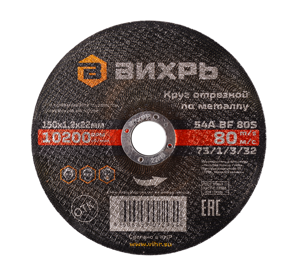 Круг отрезной Вихрь 150х1,2х22мм применяется совместно с угловыми шлифовальными машинами (болгарками) для работ по металлическим заготовкам. Диск можно раскручивать до 10200 оборотов в минуту. Круг имеет высокий запас прочности и технологичную конструкцию.Состоит из абразивного полотна, армированного для прочности специальной сеткой (бакелитовая связка), которая придает отрезному диску прочность и препятствует разлету осколков при заклинивании диска или его повреждении.