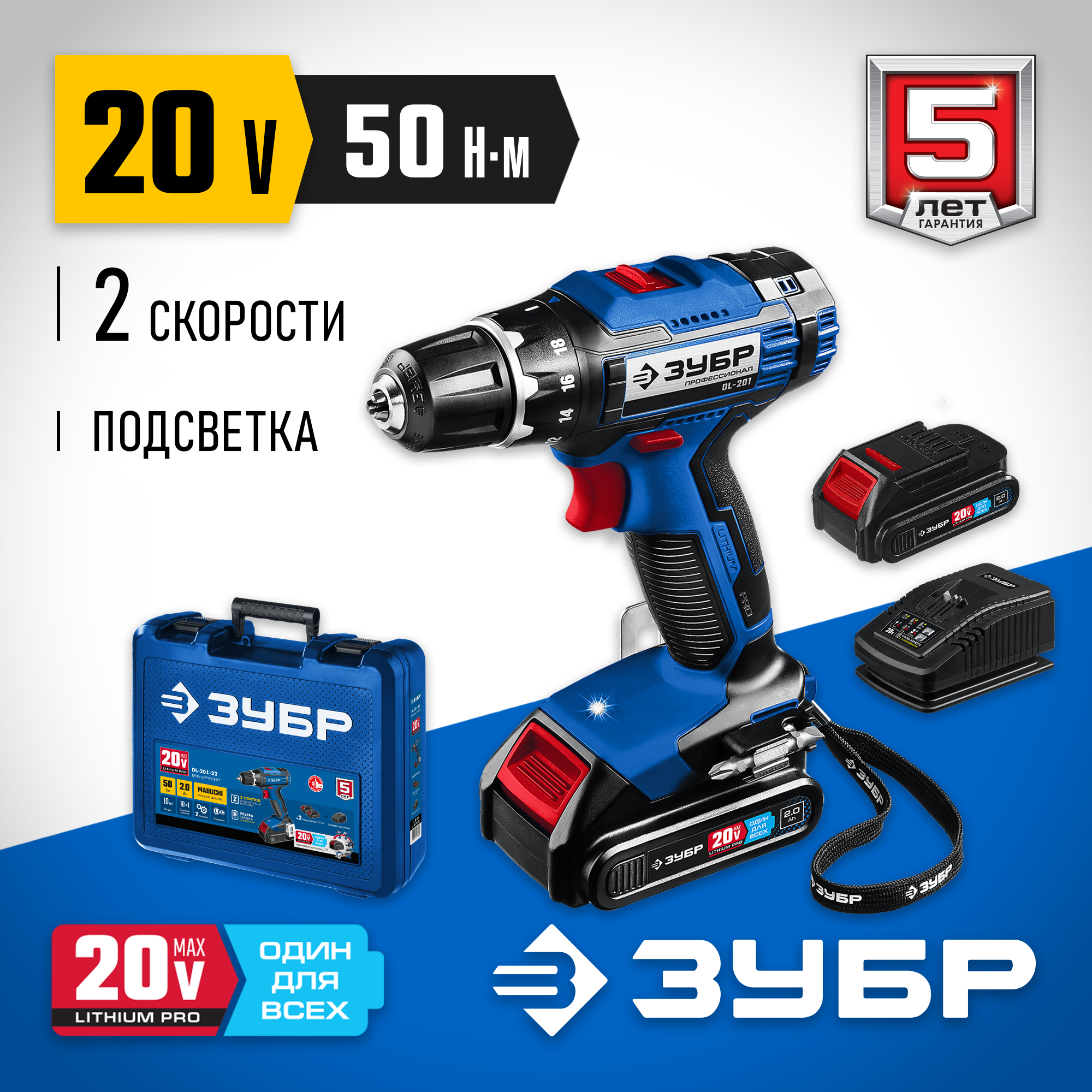 ЗУБР 20 В, 2 АКБ (2Ач), в кейсе, дрель-шуруповерт DL-201-22 Профессионал