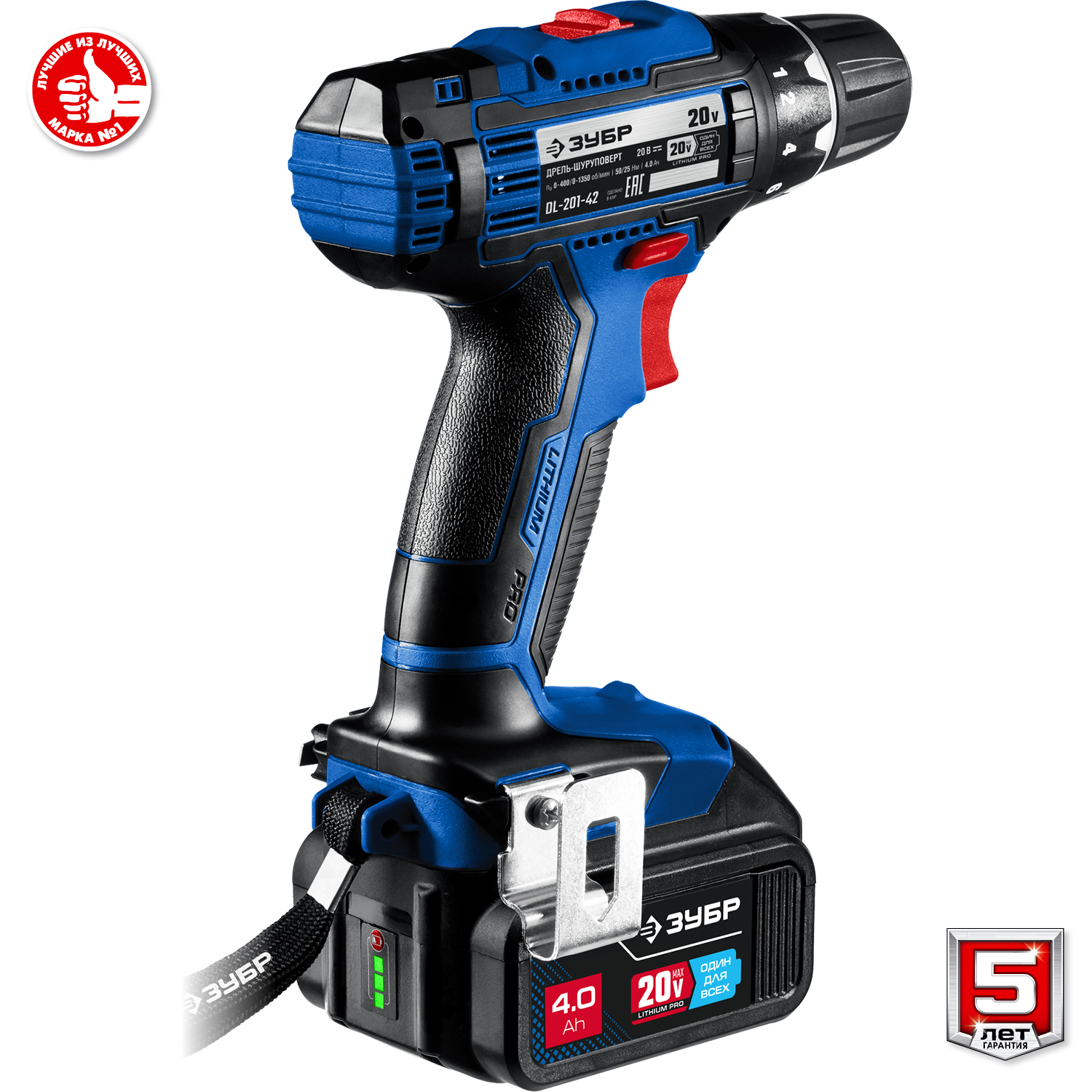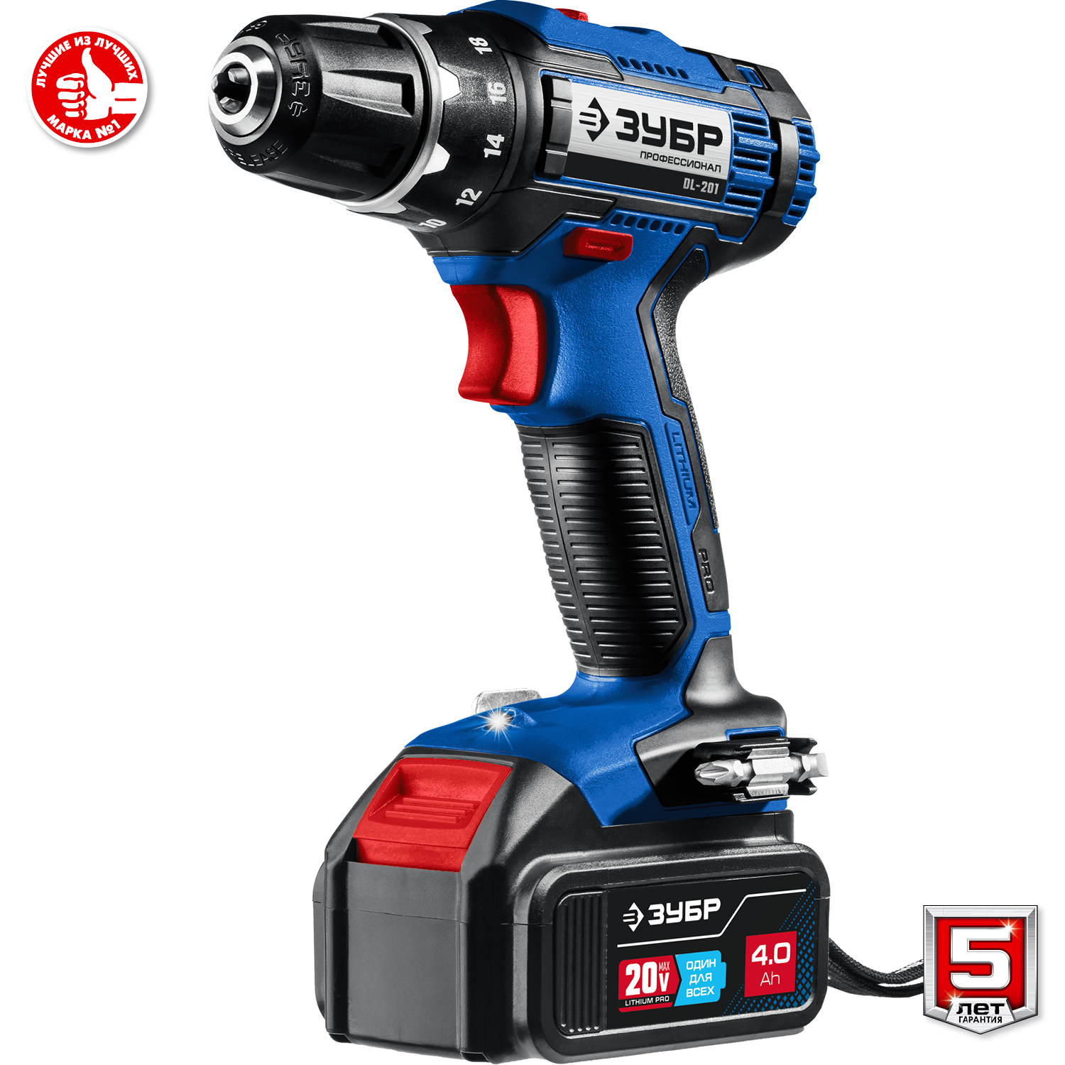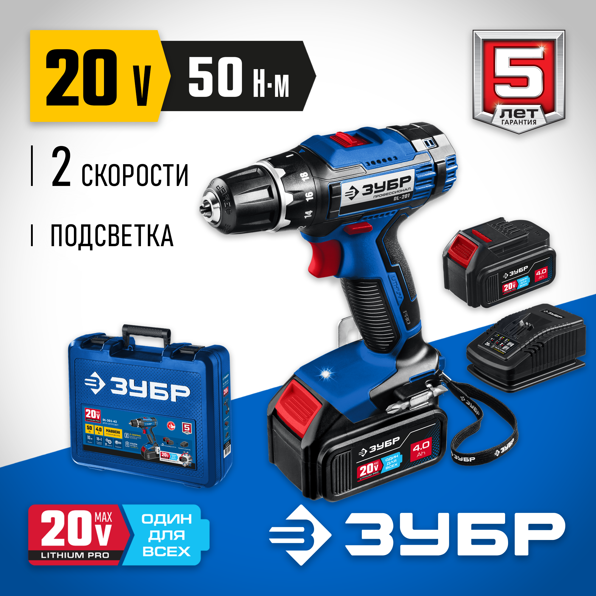 ЗУБР 20 В, 2 АКБ (4Ач), в кейсе, дрель-шуруповерт DL-201-42 Профессионал
