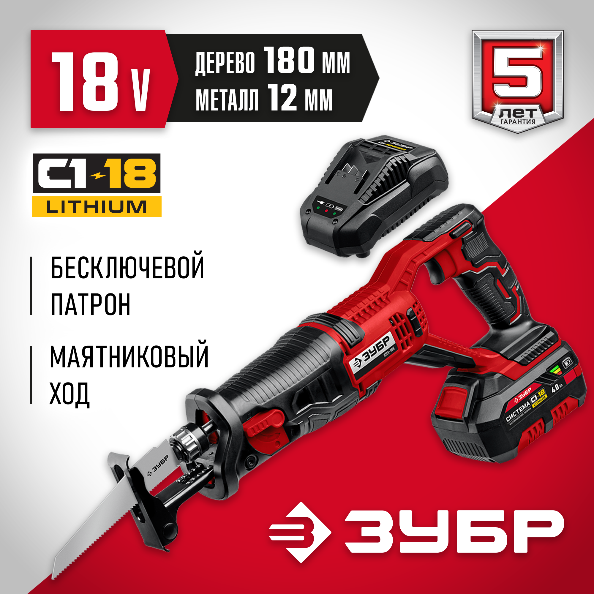 ЗУБР 18В, 1 АКБ (4Ач), в коробке, пила сабельная СПЛ-185-41 Мастер