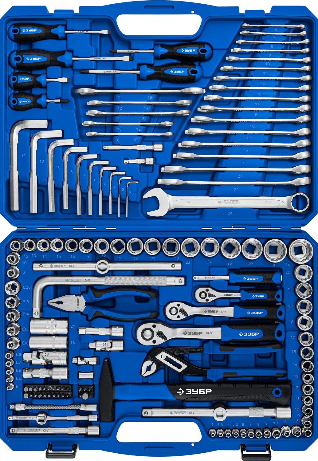Универсальный набор инструментов ЗУБР 27670-H142, предназначен для проведения слесарных, монтажных и ремонтных работ. Хромированное покрытие для защиты от коррозии. Многоступенчатая закалка для придания баланса прочности и твердости. Высококачественная Cr-V сталь. Профиль FLANK для быстрого и точного захвата крепежа. В комплект входит:Головки торцовые двенадцатигранные 1/2″ - (8,10,12,13,14,15,16,17,18,19,20,21,22,23,24,25,27,30,32 мм) - 19 шт.Головки торцовые двенадцатигранные 3/8″ - (6,7,8,9,10,11,12,13,14,15,17,18,19,21,22 мм) - 15 шт.Головки торцовые FLANK 1/4″ - (4,4.5,5,5.5,6,7,8,9,10 мм) - 9 шт.Головки торцовые E-TORX 1/2″ - (E10,E12,E14,E16,E20) - 5 шт.Головки торцовые E-TORX 1/4″ - (E4,E5,E6,E7,E8) - 5 шт.Головки торцовые свечные с резиновой вставкой 1/2″ - (16,21 мм) - 2 шт.Трещотки для торцовых головок с быстрым сбросом 72 зубца - (1/2″,3/8″,1/4″) - 3 шт.Шарниры карданные - (1/2″,3/8″,1/4″) - 3 шт.Удлинители для торцовых головок 1/2″ - (75,250 мм) - 2 шт.Удлинители для торцовых головок 3/8″ - (75,150 мм) - 2 шт.Удлинители для торцовых головок 1/4″ - (50,100,150 мм) - 3 шт.Удлинитель гибкий 1/4″ - (150 мм) - 1 шт.Адаптеры трехпозиционные - (3/8″F x 1/2″M, 3/8″F x 1/4″M) - 2 шт.Вороток-отвертка 1/4″ - (150 мм) - 1 шт.Вороток L-образный 1/2″ - (250 мм) - 1 шт.Вороток перекидной 1/2″ - 1 шт.Переходник для бит - (HEX1/4″F х SQ1/4″F) - 1 шт.Биты 1/4″ х 25 мм - (T10,T15,T20,T25,T27,T30,T40,SL4,SL5.5,SL7,H2,H3,H4,H5,H6,H7,H8,H10,PZ0,PZ1,PZ2,PZ3,PH0,PH1,PH2,PH3) -26 шт.Плоскогубцы 180 мм - 1 шт.Клещи переставные - 1 шт.Отвертки - (SL5.5 x 75,SL6.5 x 38,SL6.5 x 100,PH1 x 75,PH2 x 38,PH2 x 100 мм) - 6 шт.Молоток кованый с фибергласовой рукояткой 300 г - 1 шт.Ключи комбинированные - (6,7,8,9,10,11,12,13,14,15,16,17,18,19,21,22,24 мм) - 17 шт.Ключи рожковые - (8 х 10,10 х 12,11 х 13,12 х 14,17 х 19 мм) - 5 шт.Ключи имбусовые - (H2.5,H3,H4,H5,H6,H7,H8,H10,H12,H14) - 10 шт.
