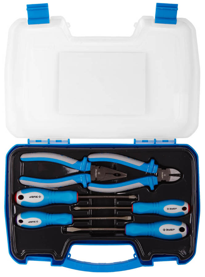 Набор инструментов ЗУБР 2201-H6_z01, предназначен для выполнения слесарных, монтажных и ремонтных работ. Эргономичные трехкомпонентные специально сконструированные рукоятки отверток оптимальной формы обеспечивают как передачу высокого крутящего момента от руки к профилю крепежа, так и быстрое выполнение работ, не требующих больших усилий. Стержни отверток изготовлены из хромованадиевой стали. Плоскогубцы и бокорезы изготовлены из специальной инструментальной стали, легированной хромом и ванадием для оптимального баланса твердости и прочности.