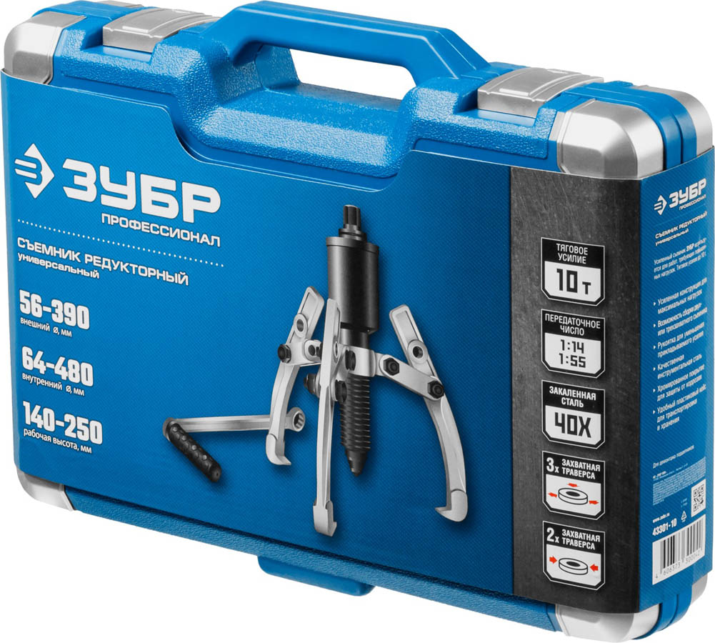 Съемник редукторный универсальный ЗУБР 43301-10, предназначен для Усиленный съемник применяется для работ с применением повышенных нагрузок. Тяговое усилие до 10 т. Возможность сборки как двух- и трехзахватного съемника, в зависимости от необходимости. Ручка для уменьшения прикладываемого усилия. Качественная инструментальная сталь. Хромированное покрытие для защиты от коррозии. Удобный пластиковый кейс для транспортировки и хранения.