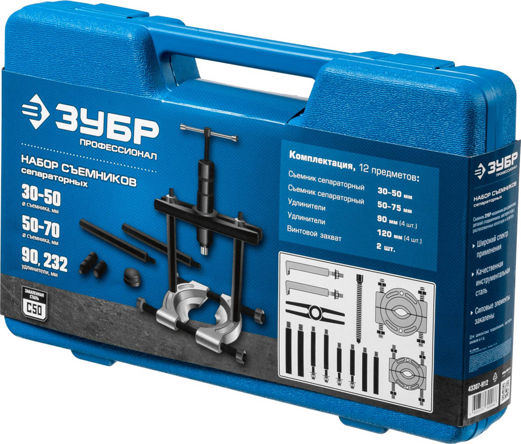 Набор съемников сепараторных ЗУБР 43307-H12, предназначен для Съемник незаменим в случаях, когда подшипники, шестерни и другие детали, которые необходимо демонтировать, расположены вплотную к агрегату. Широкий спектр применения. Качественная инструментальная сталь. Закалка силовых элементов.
