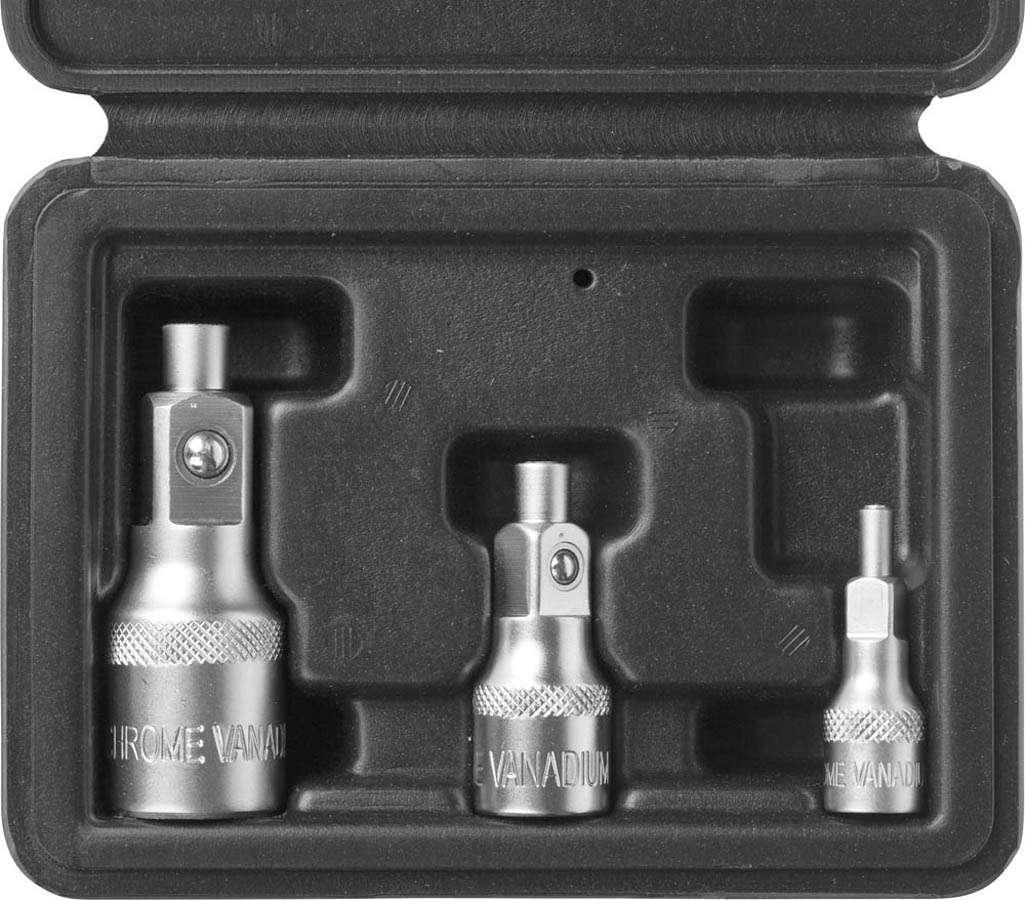 Набор адаптеров магнитных для торцовых головок ЗУБР 27712-H3, предназначен для монтажа и демонтажа резьбовых соединений при ремонте автомобилей и других механизмов и изделий. Изготовлены из хромованадиевой стали для достижения оптимального баланса прочности и твердости. Хроматированное покрытие для защиты от коррозии.