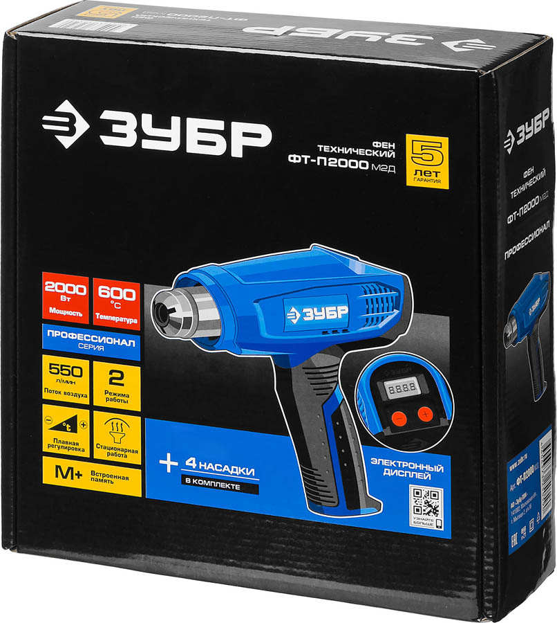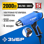 ЗУБР 2000 Вт, 1 режим: 60°С 2 режим: 80-600°С, фен технический ФТ-П2000 М2Д Профессионал