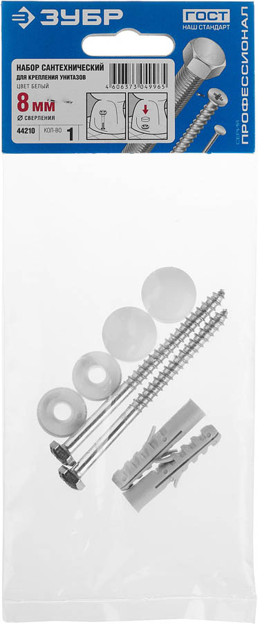 Набор ЗУБР 44210, применяется для крепления унитазов к бетонному или кирпичному основанию. Диаметр предварительного сверления: 8 мм. Наборы для крепления сантехники предлагают широкий выбор готовых решений для простого и удобного крепления различных видов сантехники (раковин, унитазов, писсуаров). Набор включает в себя полный комплект крепежных изделий, необходимых для установки унитаза: дюбели, шурупы, декоративные колпачки и втулки пластмассовые. Декоративные колпачки белого цвета фиксируются на установленных шурупах и способствуют улучшению общего эстетического вида.