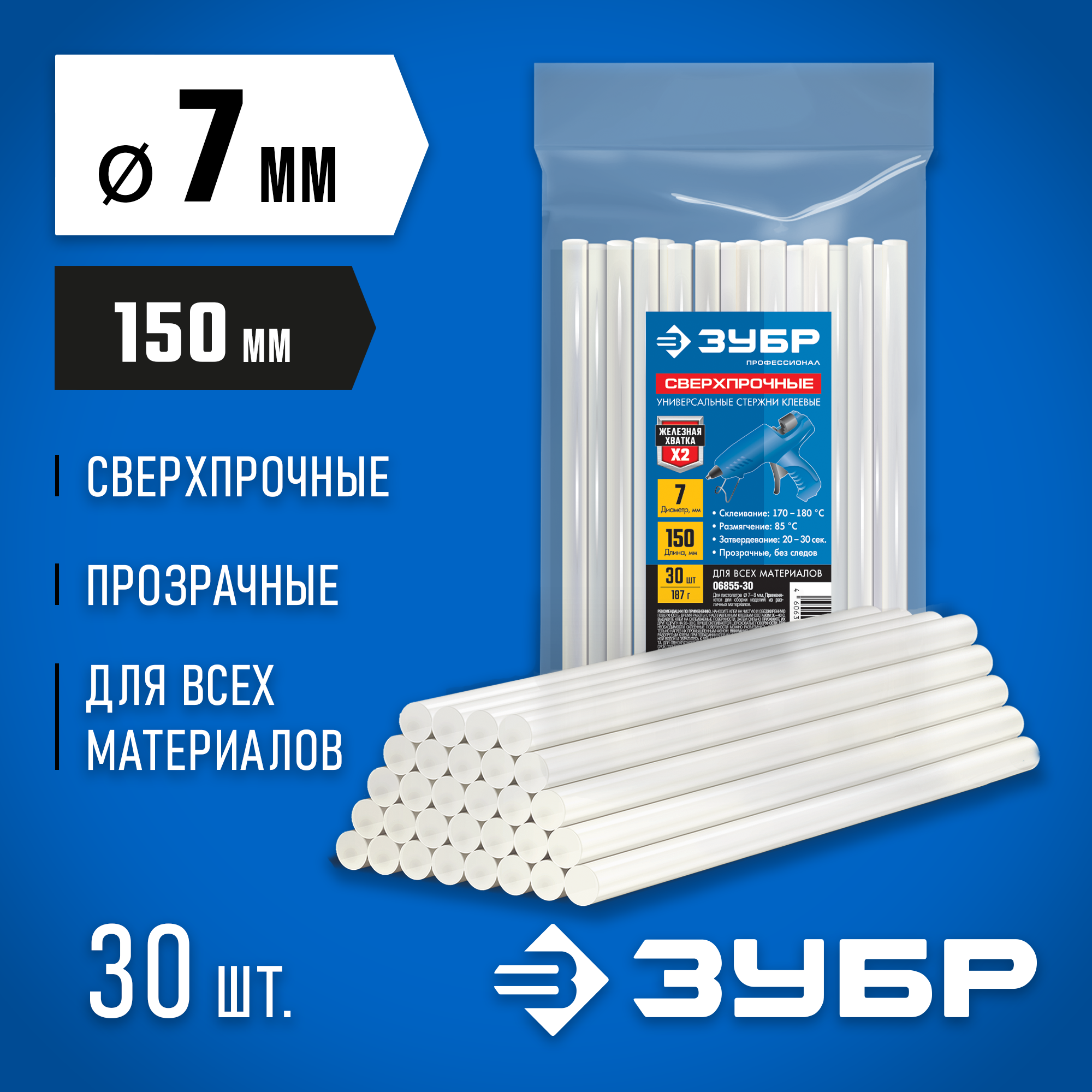 ЗУБР 30 шт., 250 г, 7х150 мм (7-8 мм), прозрачные, сверхпрочные клеевые стержни 06855-30 Профессионал