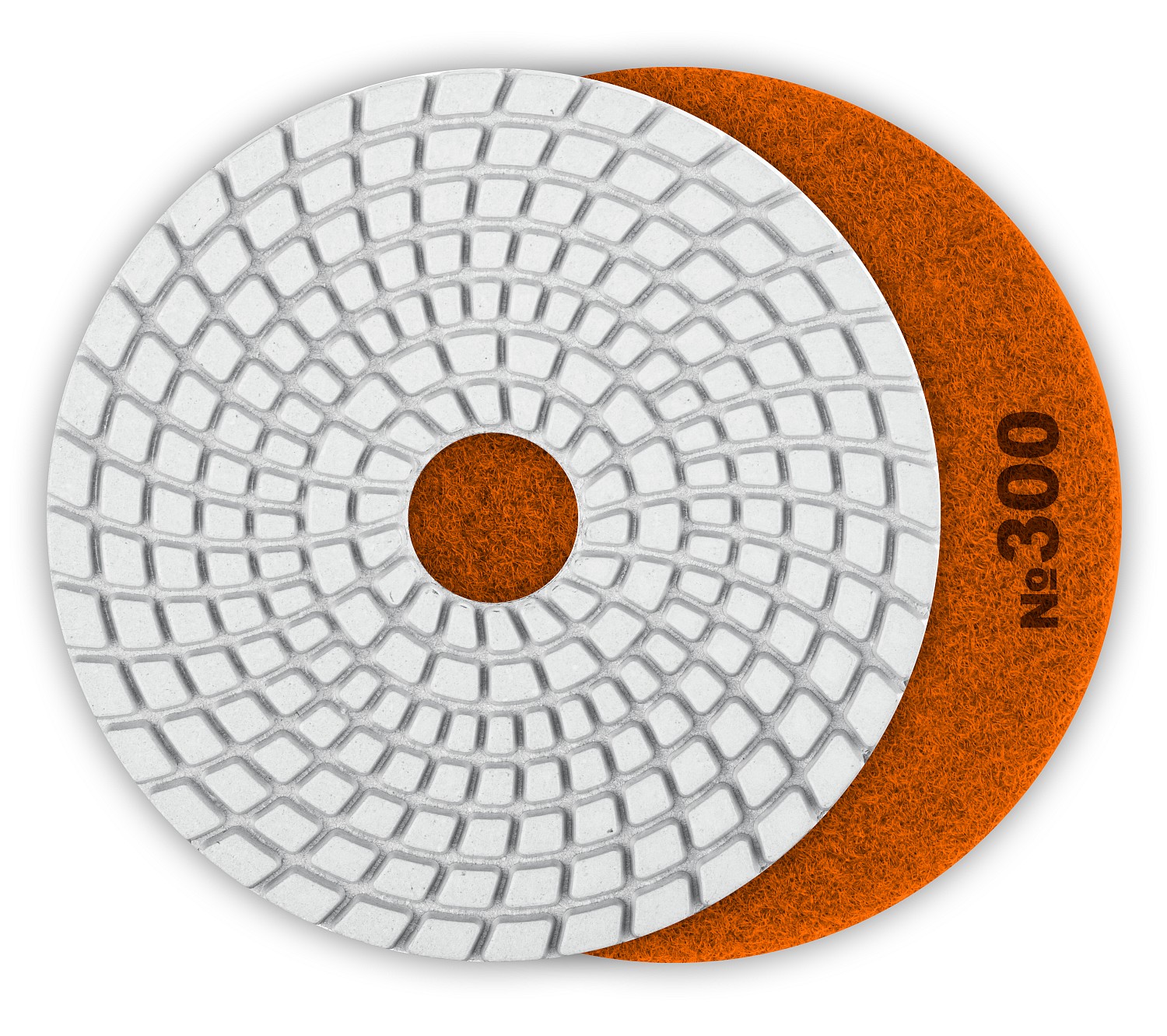 Алмазный гибкий шлифовальный круг (Черепашка) для мокрого шлифования ЗУБР 29866-300, предназначен для предназначен для предназначен для шлифовки и полировки изделий из натурального и искуственного камня, керамогранита, гранита, мрамора с применением водяного охлаждения. Используется на ручном электроинструменте (УШМ, полировальные машины, дрели) с насадкой адаптером под липучку Velcro. Высокий ресурс и производительность благодаря оптимальному соотношению связки и фракции алмаза. Гибкая основа позволяет обрабатывать не только ровные плоскости, но и поверхности с плавными линиями изгибов. Система крепления Velcro (липучка) обеспечивает быструю замену круга. Широкая сфера применения: обработка каменных столешниц, подоконников, ступеней, скульптур, декоративной плитки, снятие фасок, заусовка, полировка сколов, различные реставрационные работы.