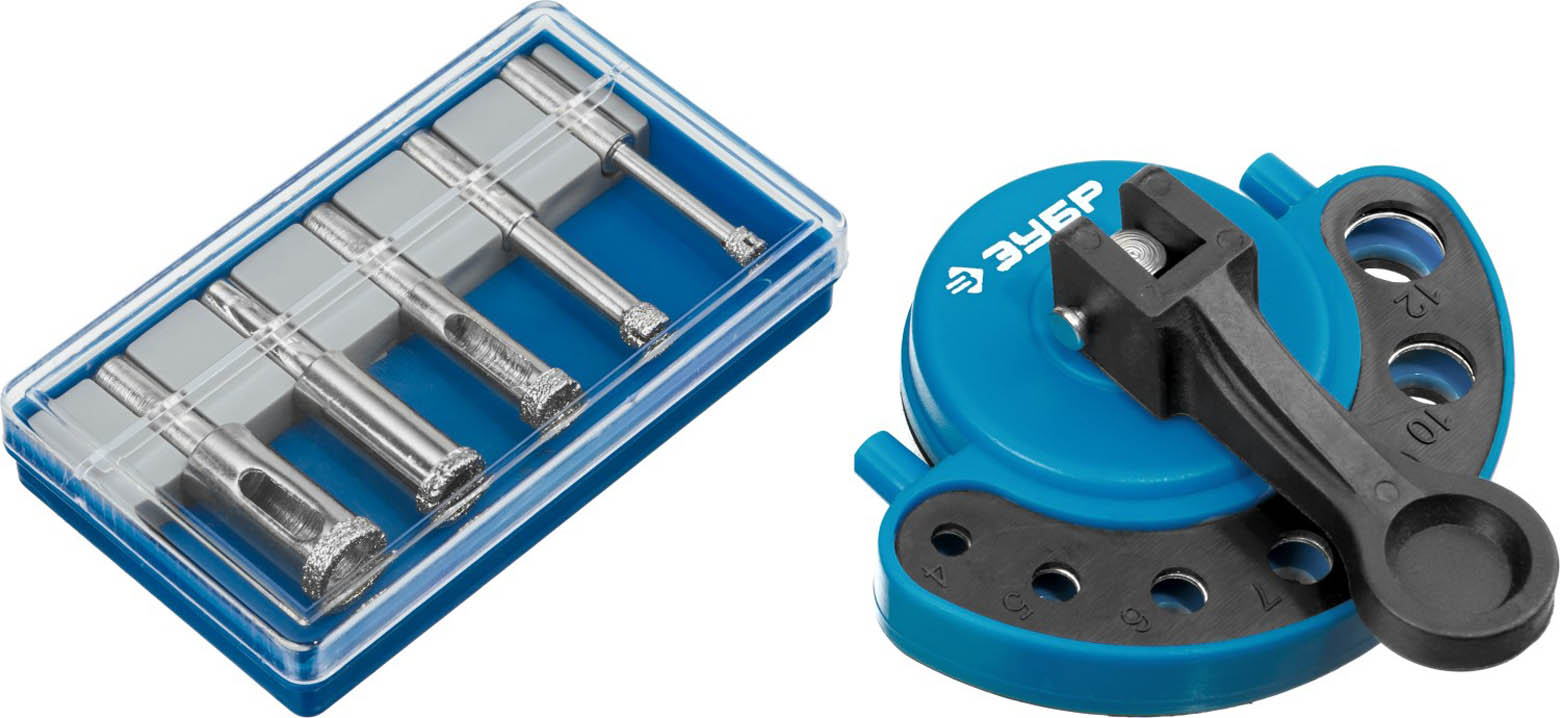 ЗУБР Ø4, 6, 8, 10, 12 мм, 5 предметов, набор сверл алмазных трубчатых по кафелю и стеклу с кондуктором 29851-H6