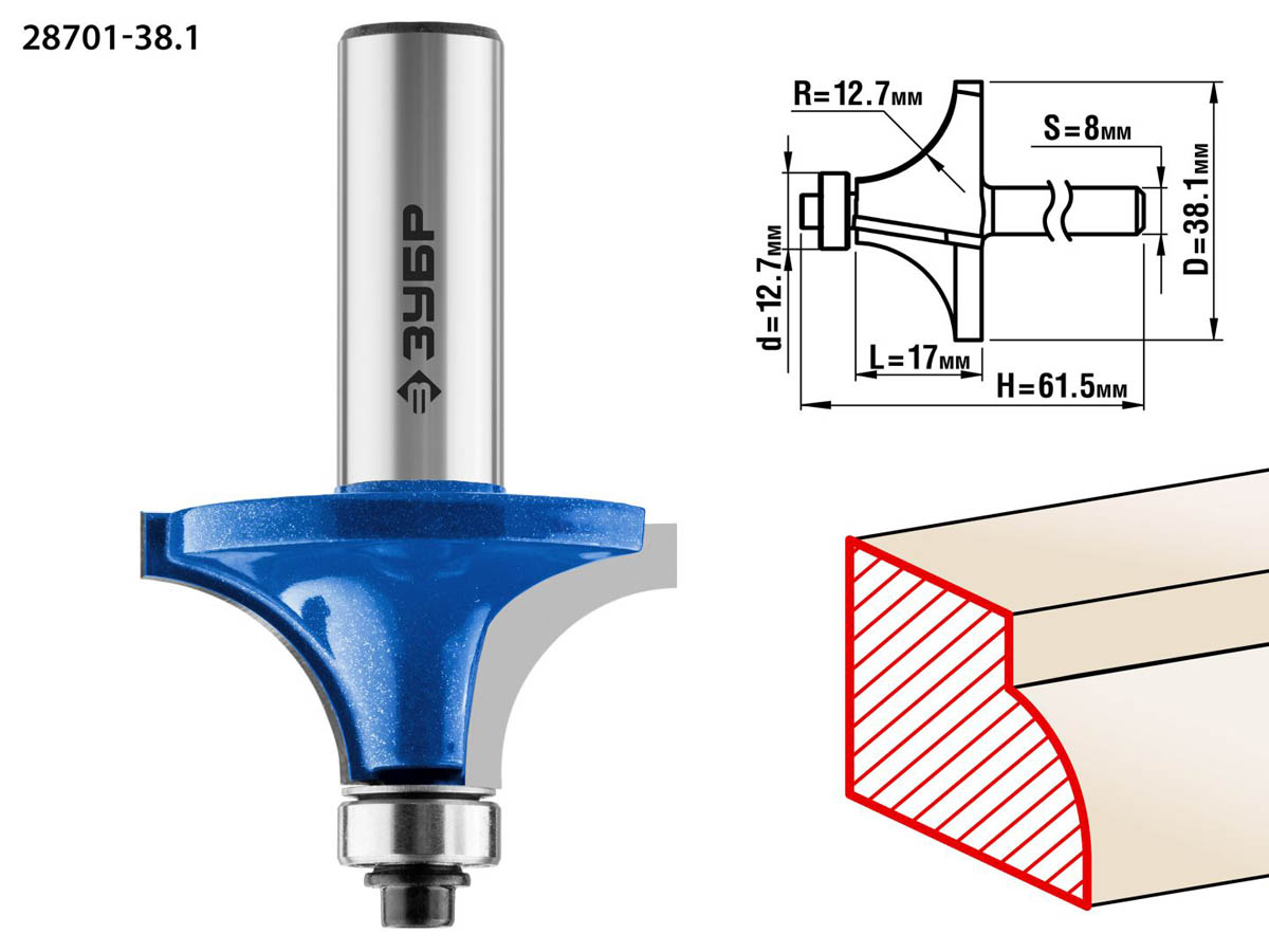 ЗУБР 38.1 x 17 мм, радиус 12.7 мм, фреза кромочная калевочная №1 28701-38.1 Профессионал