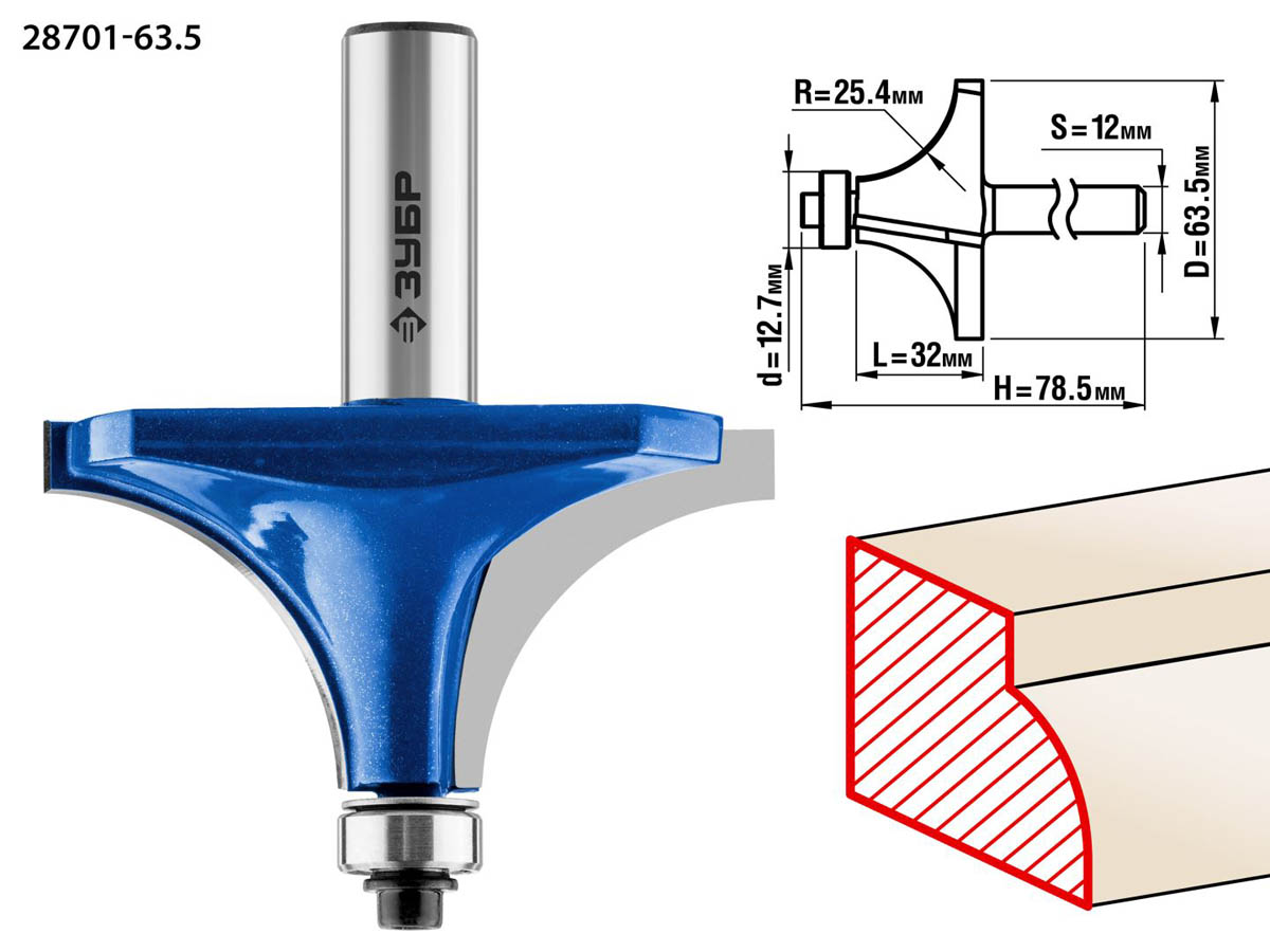 ЗУБР 63.5 x 32 мм, радиус 25.4 мм, фреза кромочная калевочная №1 28701-63.5 Профессионал