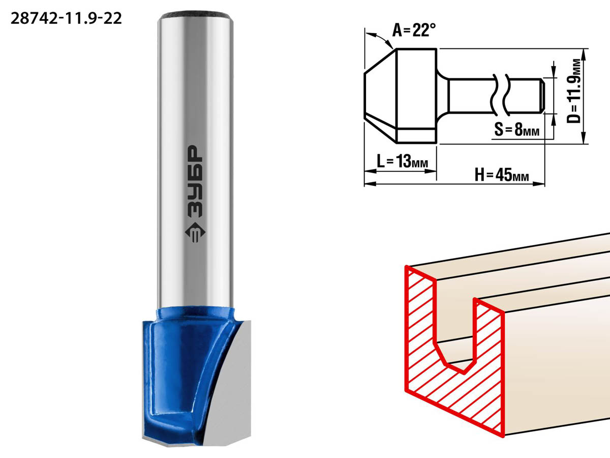 ЗУБР 11.9 x 13 мм, фреза пазовая фасонная №3 28742-11.9-22 Профессионал