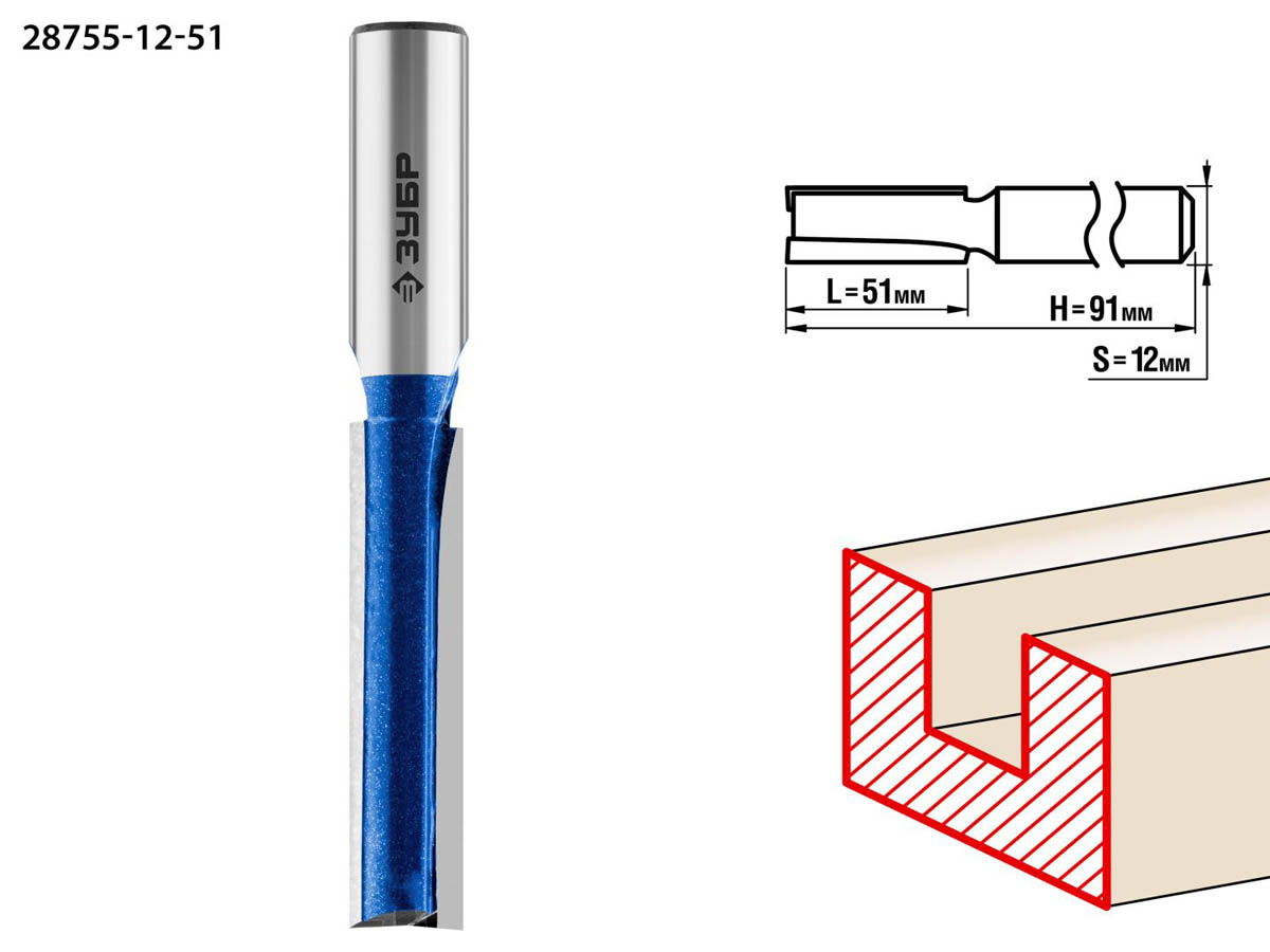 ЗУБР 12 x 51 мм, хвостовик 12 мм, фреза пазовая прямая с нижними подрезателями 28755-12-51 Профессионал