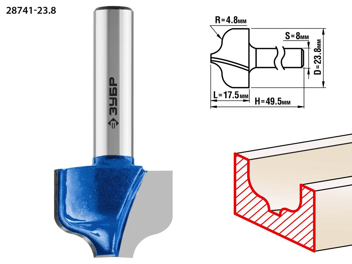 ЗУБР 23.8 x 17.5 мм, радиус 4.8 мм, фреза пазовая фасонная №2 28741-23.8 Профессионал