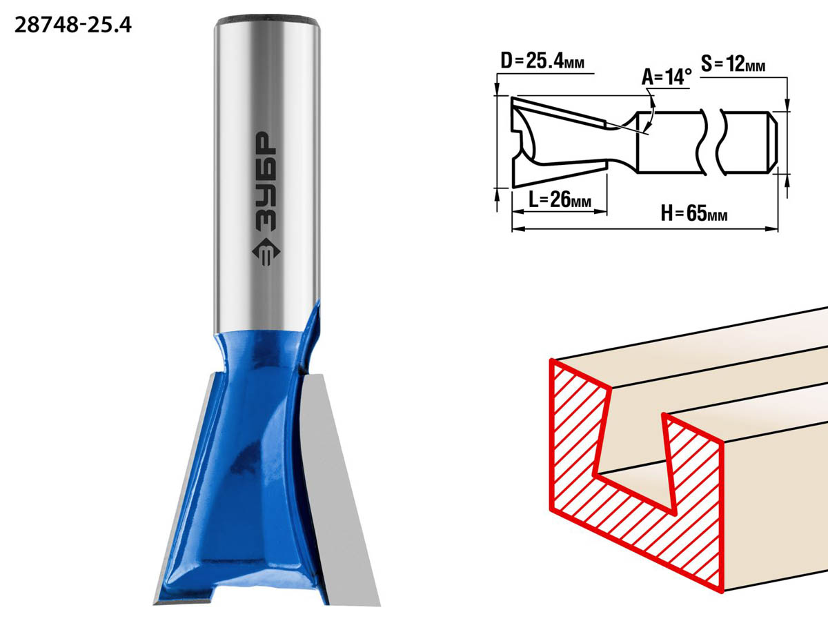 ЗУБР 25.4 x 26 мм, угол 14°, фреза пазовая фасонная ''Ласточкин Хвост'' 28748-25.4 Профессионал