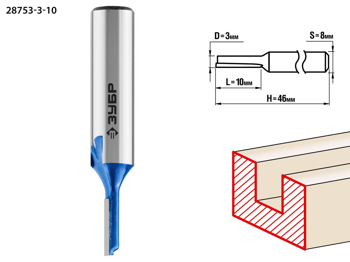ЗУБР 3 x 10 мм, хвостовик 8 мм, фреза пазовая прямая 28753-3-10 Профессионал