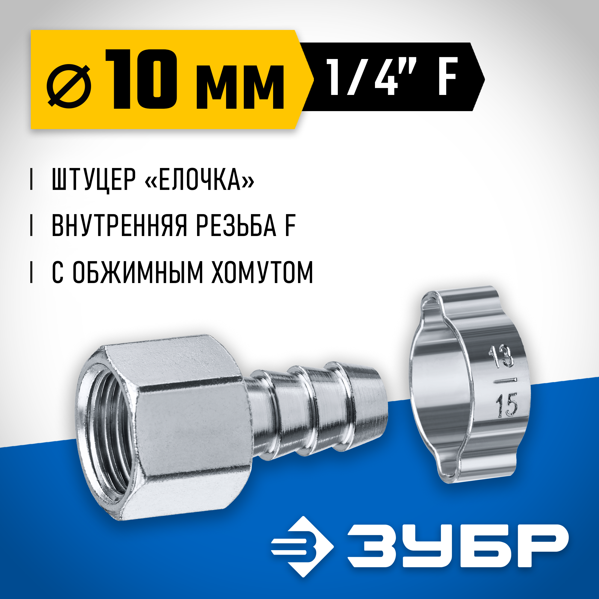 ЗУБР 10 мм, штуцер 1/4''F, с хомутом, переходник для пневмоинструмента 64923-1/4-10 Профессионал