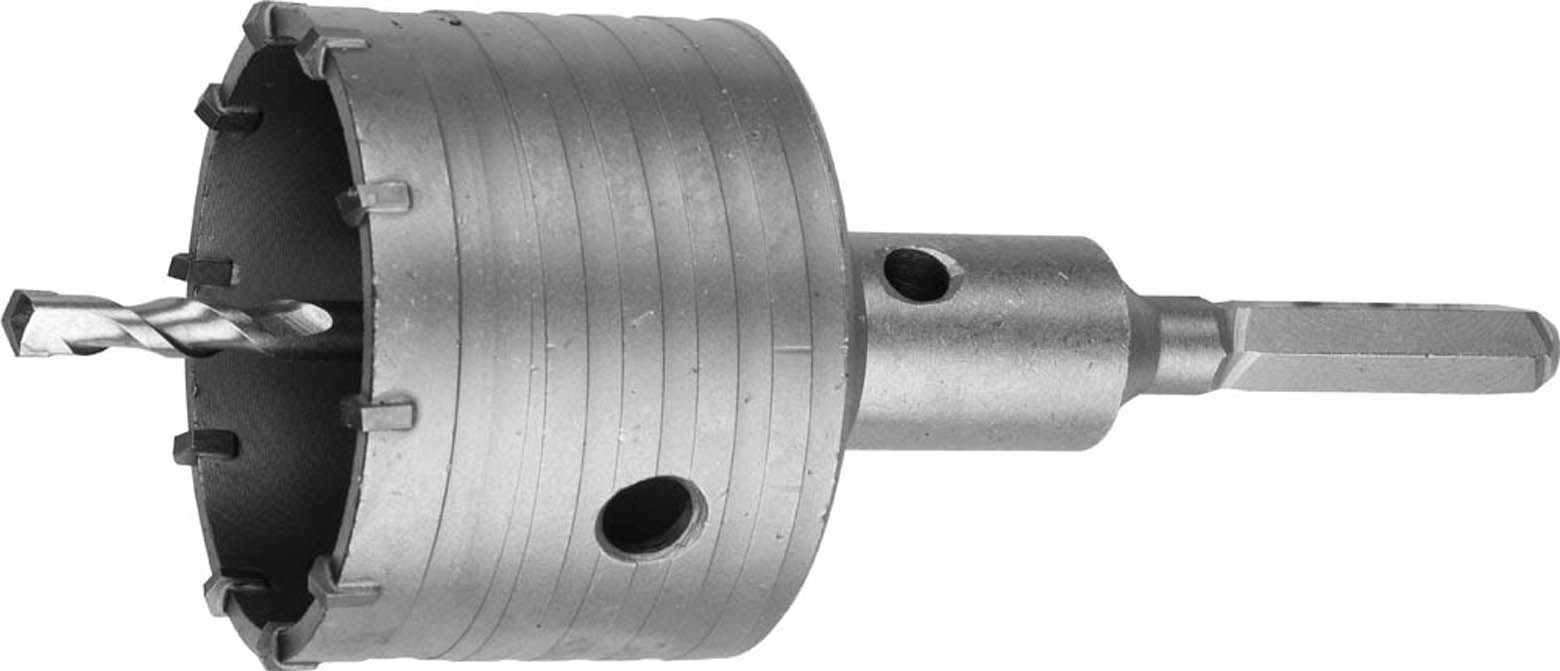 Коронка буровая в сборе ЗУБР 2917-80_z01, предназначена для сверления отверстий в бетоне, кирпиче, природном и искусственном камне, а также в плотных известняках. Твердосплавные зубья из сплава ВК85. Буровая коронка с полной оснасткой. Шестигранный хвостовик. Коническое соединение с центрующим сверлом. Спиралевидная резьба коронки для улучшенного пылеудаления продуктов сверления. При прокладке коммуникаций в строящемся здании не обойтись без коронок по бетону. Они позволяют без труда получать отверстия среднего или большого диаметра в самых прочных материалах. Коронки имеют твердосплавные зубья из сплава ВК85, усовершенствованную систему крепления сверла на конус и резьбовое соединение с державкой М22.