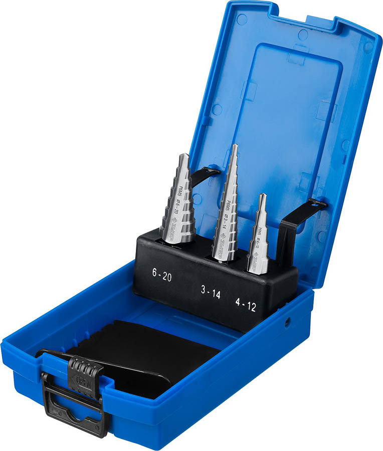 Ступенчатое сверло по металлу набор ЗУБР 29670-3-20-H3_z01, предназначено для сверления листового металла толщиной до 4 мм, цветных металлов, пластмасс и других материалов. Сверло изготовлено методом шлифования профиля по ГОСТ 10902-77 и соответствует классу точности сверления 'А1'. Угол заточки при вершине равный 135°, оснащенный крестообразной подточкой, позволяет сверлить тугоплавкие металлы и сплавы без предварительного кернения.