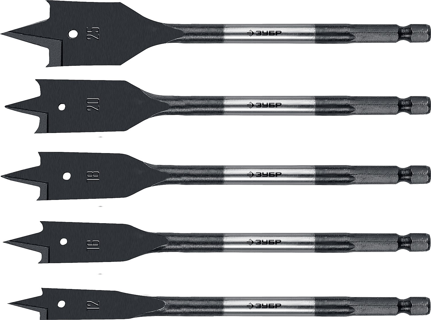 ЗУБР 5 шт., Ø 12-16-18-20-25 мм, хвостовик HEX 1/4'', набор перовых сверл по дереву с боковыми подрезателями 29505-H5 Мастер