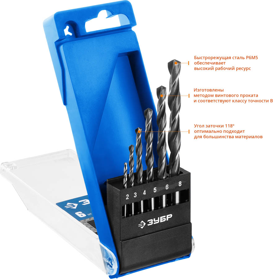ЗУБР 6 шт. (Ø 2-8 мм), класс В, Р6М5, набор сверл по металлу 29621-H6 Профессионал