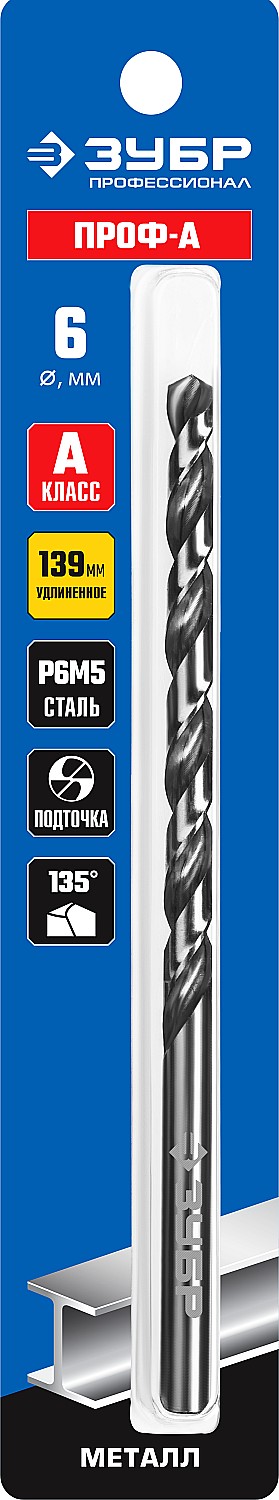 ЗУБР Ø 6 x 139 мм, сталь Р6М5, класс А1, сверло удлиненное по металлу 29624-6 Профессионал