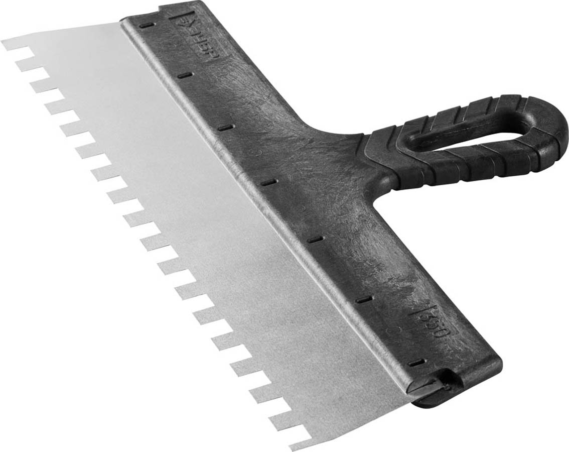 Шпатель фасадный ЗУБР 10078-30-10, предназначен для нанесения и выравнивания строительных и клеевых смесей. Благодаря зубчатой кромке шпатель идеально подходит для работы со строительными и клеевыми смесями, полотно из нержавеющей стали обеспечивает надежность и долгий срок службы инструмента, а удобная пластмассовая рукоятка создает условия для комфортной работы.