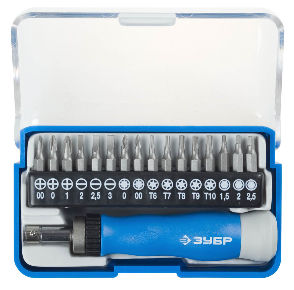 Набор отверток ЗУБР 25626-H17, предназначен для выполнения прецизионных работ в электронике и электромеханике. Биты из хромованадиевой стали. Шариковый держатель обеспечивает быструю и надежную замену насадок. Эргономичная рукоятка с контейнером для хранения бит в корпусе. Затыльник рукоятки свободно вращается, что обеспечивает легкое и удобное закручивание и повышает точность выполнения работ. Отвертка оснащена реверсивным храповым механизмом. Направление вращения меняется одной рукой.