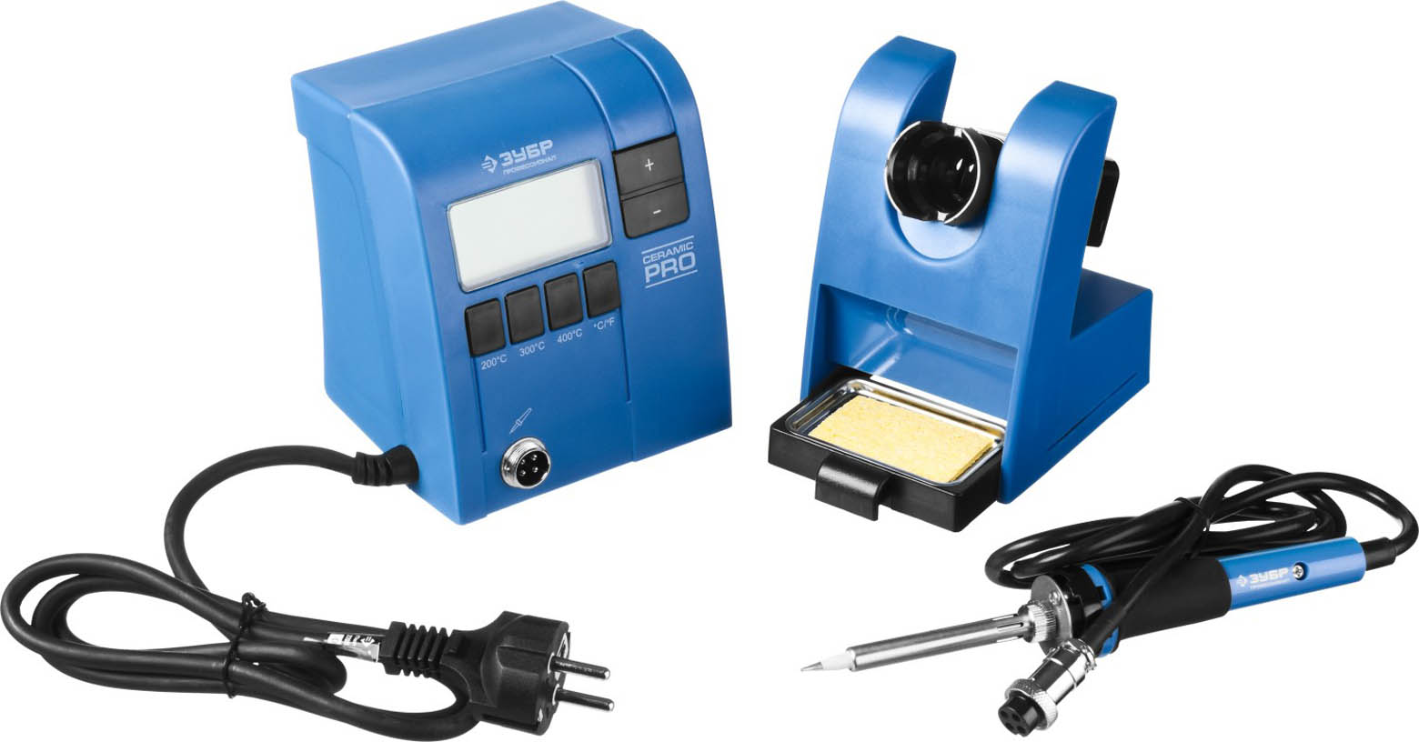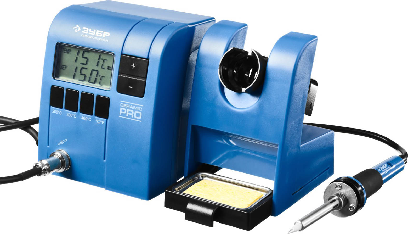 Паяльная станция ЗУБР 55335, применяется для паяльных работ, требующих бережную пайку при определенной температуре. станция ЗУБР особенно удобна при пайке электронных плат и других мелких деталей, поскольку поддерживает заданную температуру и не нуждается в отключении от электросети во время работы. Температура устанавливается с помощью кнопок, отвечающих за увеличение/уменьшение температуры с шагом 1С, а также с помощью кнопок фиксированных температур. На ЖК-дисплее отображается процесс нагревания/остывания и температура жала паяльника. Выключатель обеспечивает удобство эксплуатации паяльной станции. В станции предусмотрен отсек для очистки жала от припоя. Подставка, поставляемая в комплекте, удобна при выполнении паяльных работ и обеспечивает безопасность.