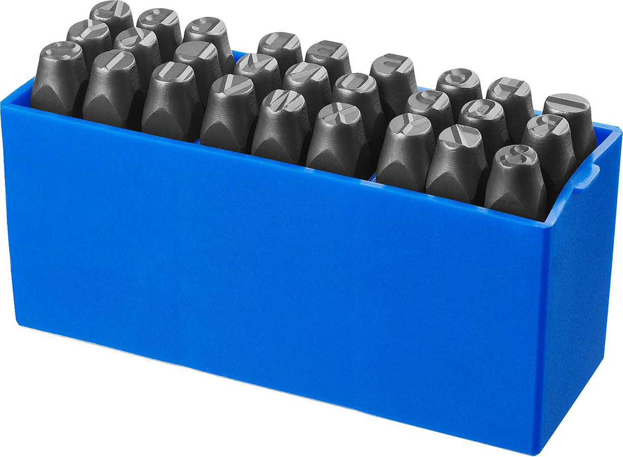 Клейма ЗУБР 21505-08_z01, предназначены для нанесения штампов в виде буквенных символов (латинские буквы) на различные поверхности. Профессиональные клейма «ЗУБР» со специальным никелированным покрытием обладают повышенным ресурсом. Применяются в промышленности, коммунальном секторе, профессиональных и личных мастерских. Изготовлены из высококачественной легированной хромом инструментальной стали. Специальная закалка до твердости 60–65 HRC.