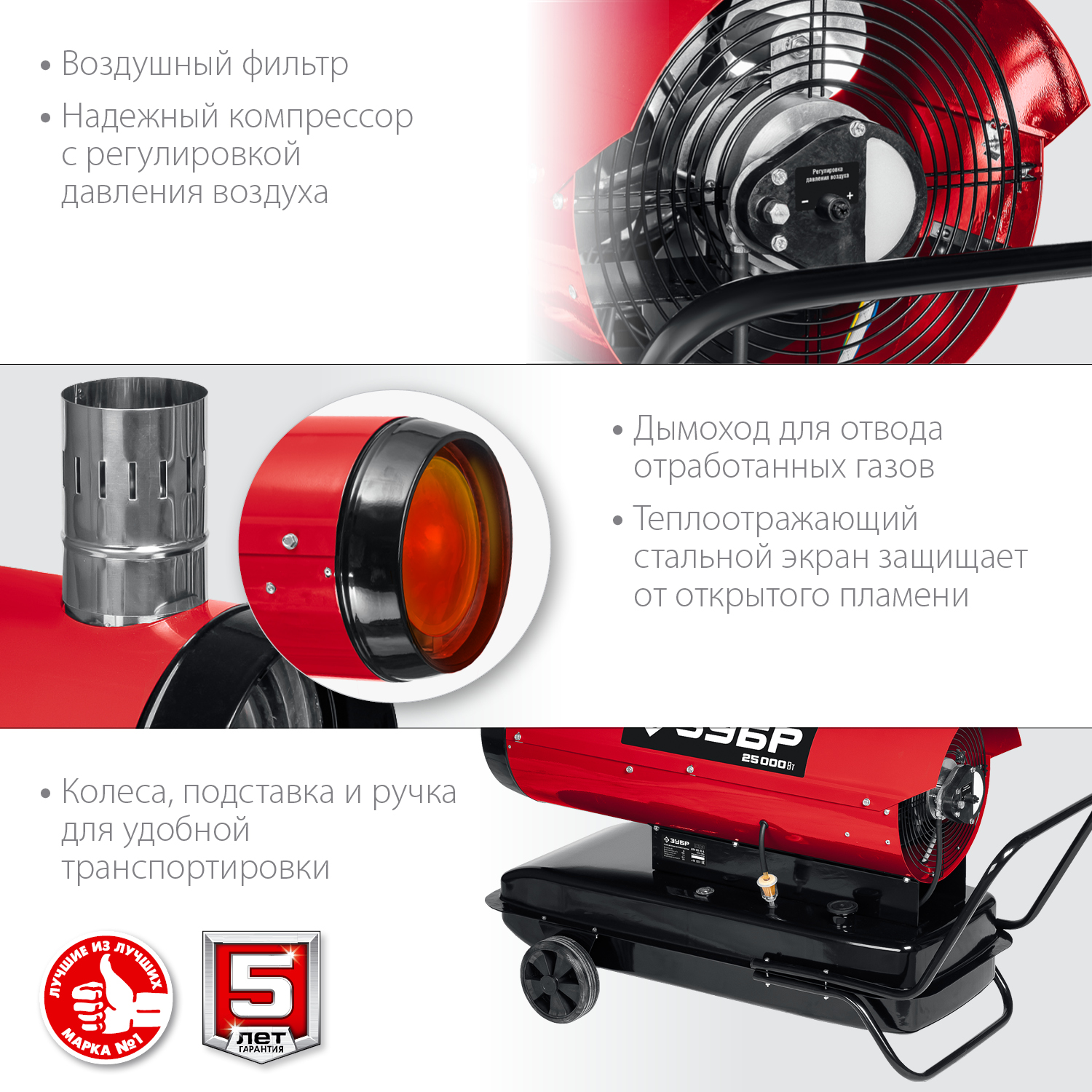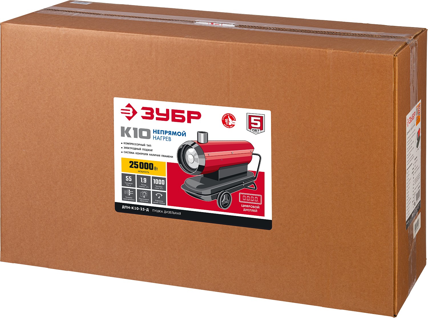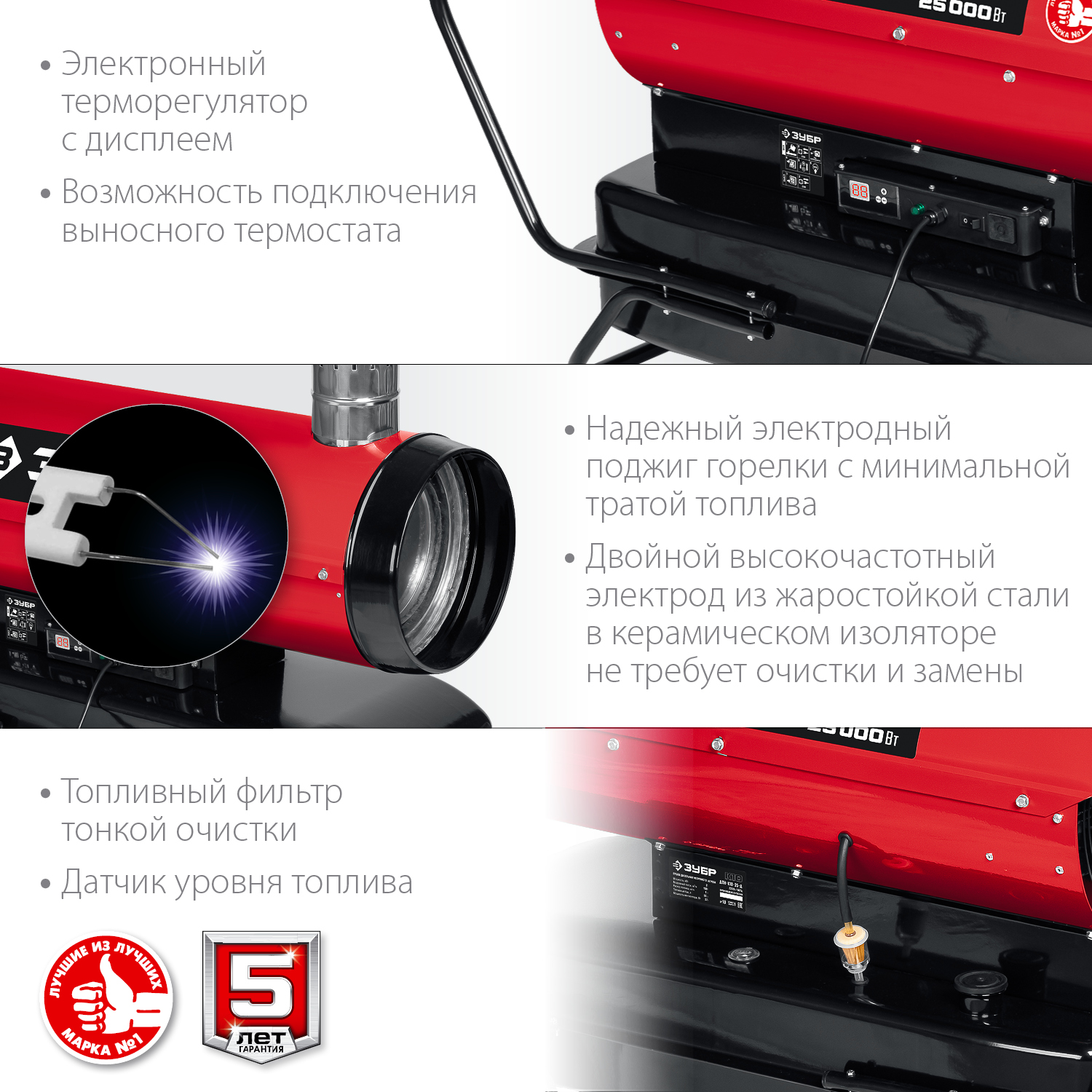 Дизельная тепловая пушка ЗУБР ДПН-К10-25-Д, предназначена для использования на строительных площадках, просушки проветриваемых помещений, обогрева складских комплексов. Высокоэффективная конструкция позволяет достигать КПД работы теплогенератора до 82%. Низкое энергопотребление способствует экономичности. Качественная горелка гарантирует эффективное бесперебойное горение и долгий срок службы. Двойной электрод из жаростойкой стали в керамическом изоляторе обеспечивают надежный поджиг горелки при минимальных потерях топлива и не требует очистки и замены. Камера сгорания повышенной толщины из жаропрочной стали. Электронный регулятор температуры и возможность подключения внешнего термостата позволяет использовать устройство в автономном режиме, автоматически поддерживая заданную для работы температуру.