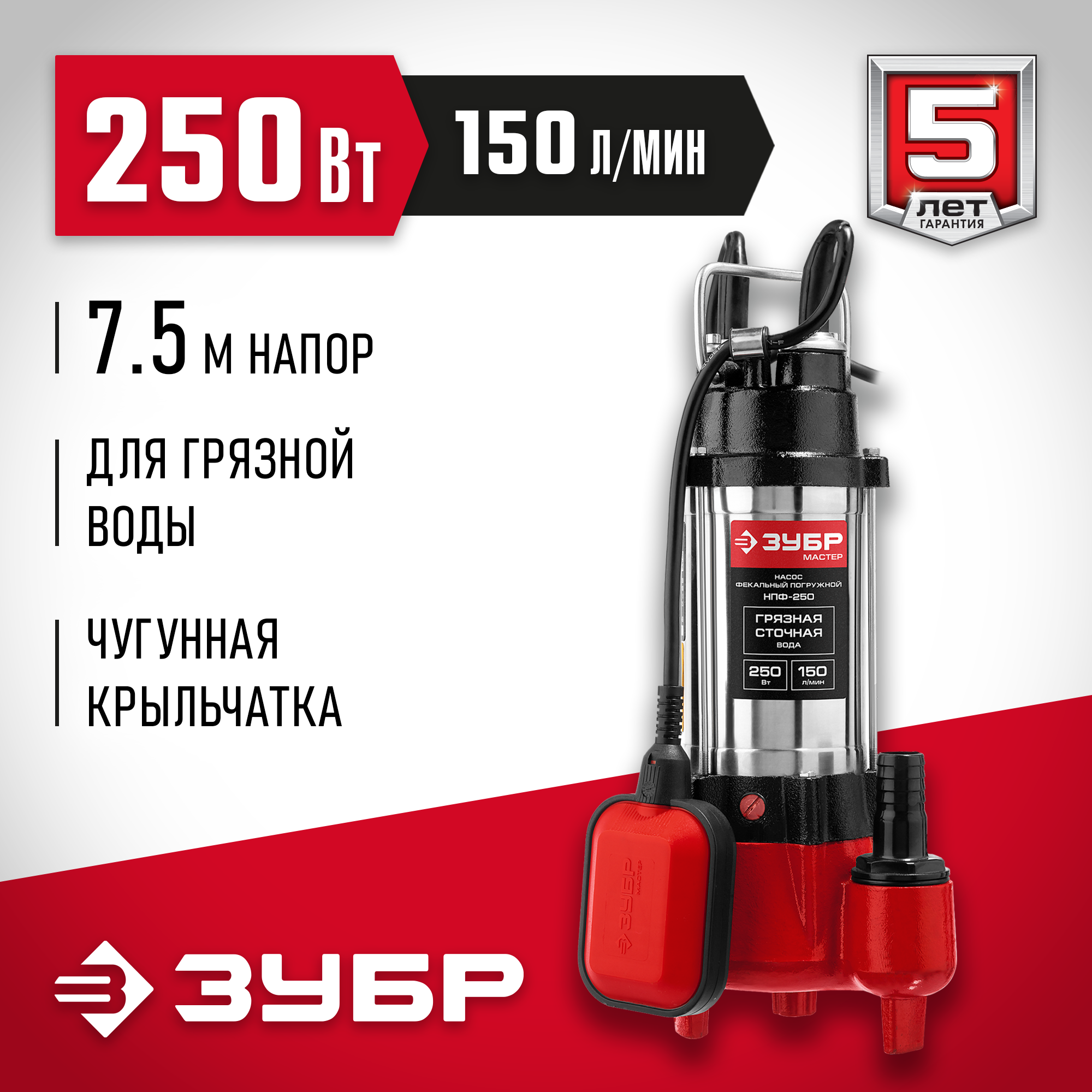 ЗУБР 250 Вт, 150 л/мин, насос фекальный погружной для загрязненной воды НПФ-250