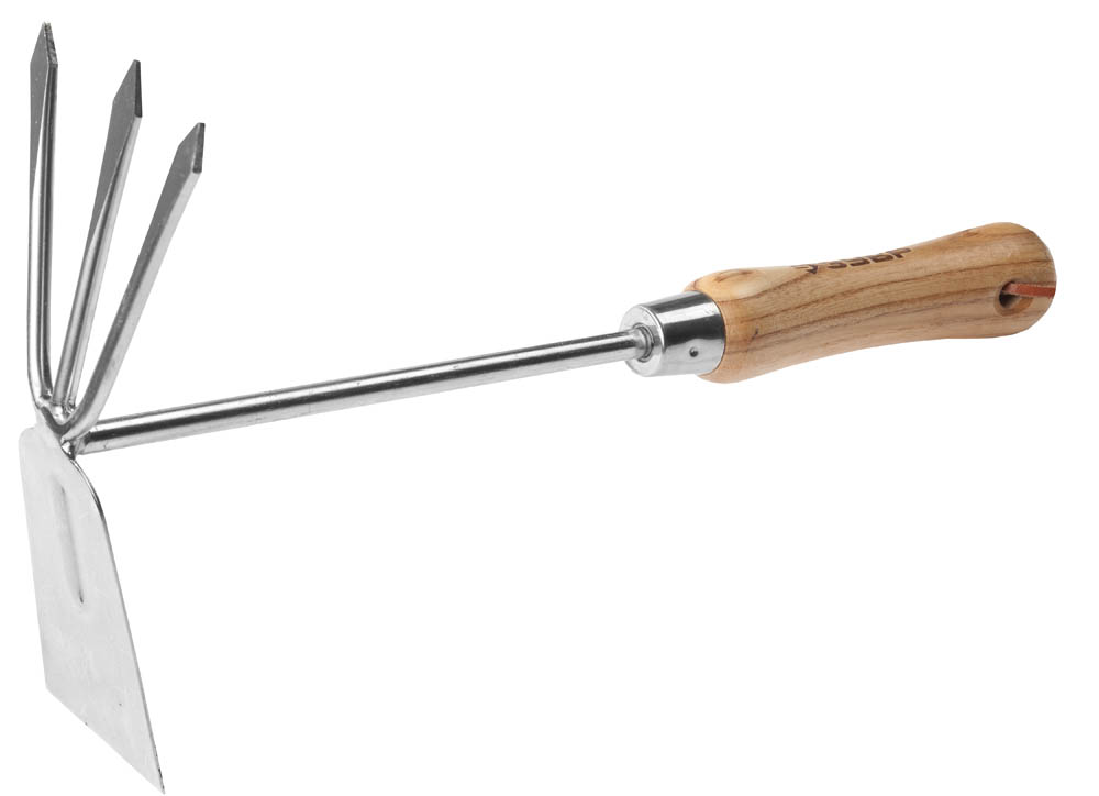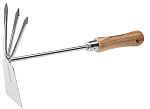 Мотыжка Зубр 4-39472, комбинированная объединяет в себе 2 инструмента - мотыгу и культиватор. Этот универсальный инструмент применяется для рыхления и аэрирования почвы, прополки растений, сбора мусора. Рабочая часть - двухсторонняя, состоит из грабелек с тремя зубьями и мотыжки. Закалённая нержавеющая сталь и рукоятка из твёрдой древесины высшего сорта гарантируют продолжительный срок службы инструмента. На рукоятке имеется специальная петелька для подвешивания и удобного хранения.