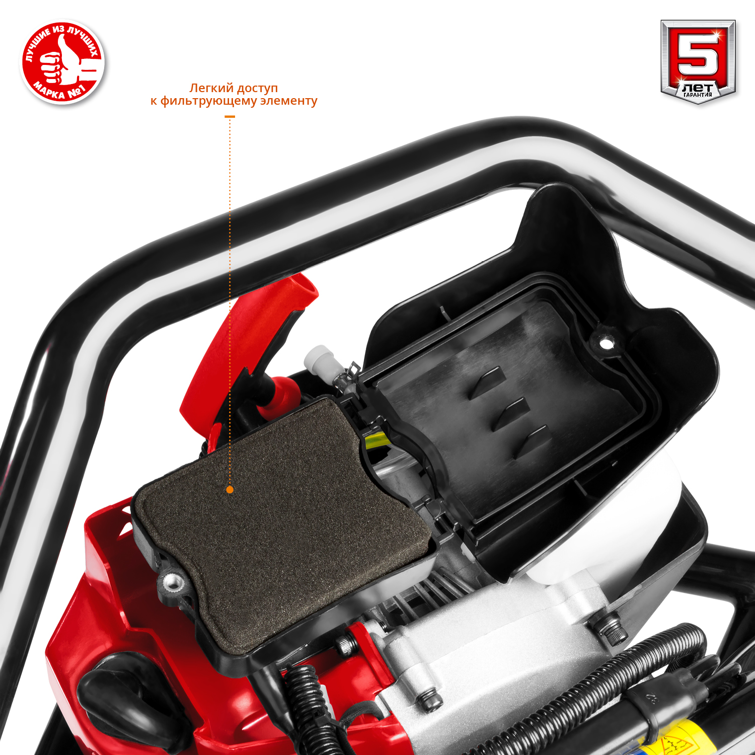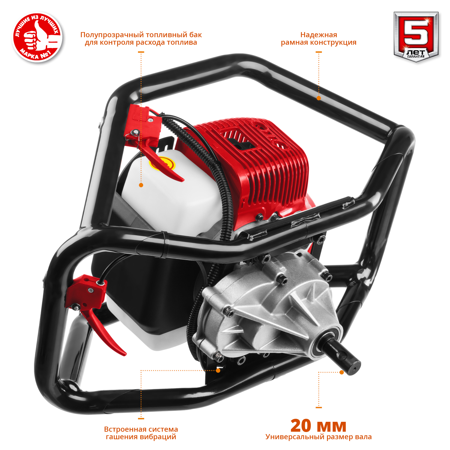 Мотобур (бензобур) ЗУБР МБ2-250 Н, предназначен для бурения мягких, твердых и мерзлых грунтов, а так же бурения льда при монтаже столбов, заборов, ограждений и других целей связанных с бурением грунта. Топливный насос для облегчения запуска. Воздушное охлаждение двигателя. Надежная рамная конструкция. Быстросъемное соединение шнека. Полупрозрачный топливный бак для контроля за расходом топлива. Система гашения вибрации. Емкость для приготовления рабочей смеси в комплекте. Инструмент управляется двумя операторами. Конструкция рукоятки позволяет работать как одному оператору, так и двум одновременно, что повышает эффективность бурения и обеспечивает дополнительную сохранность двигателя при работе и транспортировке. Шнек в комплекте.