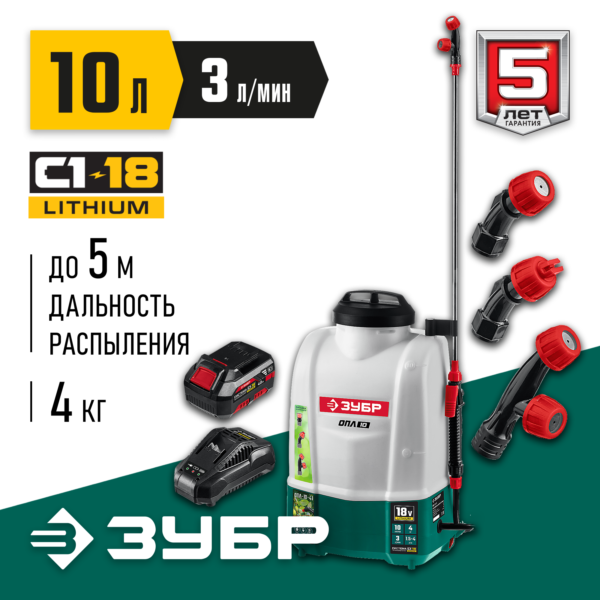 ЗУБР 18 В, Li-Ion, 10 л бак, 1 АКБ (4А/ч), опрыскиватель аккумуляторный ОПЛ-10-41 Мастер