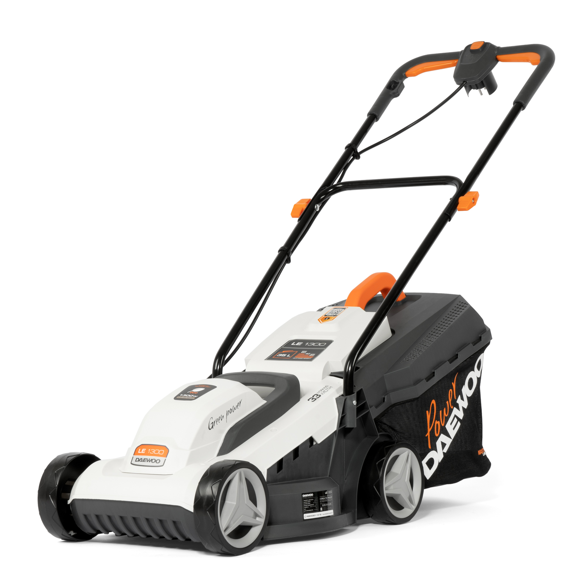 Производитель двигателя : Daewoo |Тип двигателя : щеточный |Ширина среза : 330 мм |Высота среза : 20-60 мм |Регулировка высоты среза : 3 уровня 20/40/60 |Объем травосборника : 35 л |Материал корпуса : комбинированный |Напряжение : 230 B |Частота тока : 50 Гц |Скорость вращения : 3400 об/мин |Диаметр/ширина колес (передние/задние), мм : 140х40/140 |Наличие привода движения : нет |Мощность двигателя : 1300 Вт |