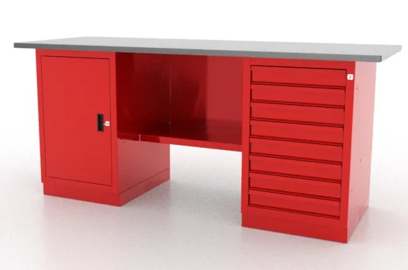 Верстак изготовлен из качественной стали, имеет прочную и надежную конструкцию. Поверхности покрыты порошковой эпоксидно-полиэфирной краской красного цвета (RAL 3000) с глянцевой структурой.