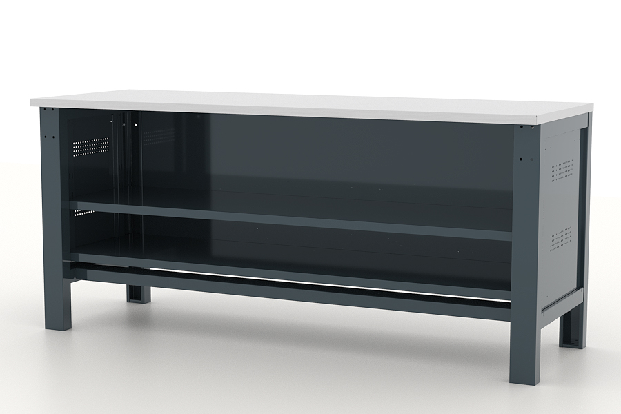 В основе верстака усовершенствованной конструкции расположена особо прочная стальная рама с силовыми балками и верстачными опорами. Все поверхности покрыты высококачественной порошковой эпоксидно-полиэфирной краской RAL 7016 с глянцевой текстурой. Столешница 1880х620 мм выполнена из влагостойкой шлифованной фанеры толщиной 27 мм и покрыта оцинкованным кожухом 1,2 мм. Торцы столешницы закрыты кожухом со всех 4 сторон, а с фасадной части он подвернут под столешницу.