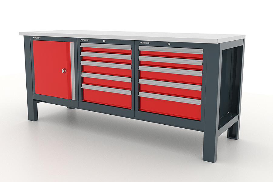 В основе верстака усовершенствованной конструкции расположена особо прочная стальная рама с силовыми балками и верстачными опорами. Все поверхности покрыты высококачественной порошковой эпоксидно-полиэфирной краской RAL 7016 и 3000 с глянцевой текстурой. Удлиненная столешница 1880х620 мм выполнена из влагостойкой шлифованной фанеры толщиной 27 мм и покрыта оцинкованным кожухом 1,2 мм. Торцы столешницы закрыты кожухом со всех 4 сторон, а с фасадной части он подвернут под столешницу.