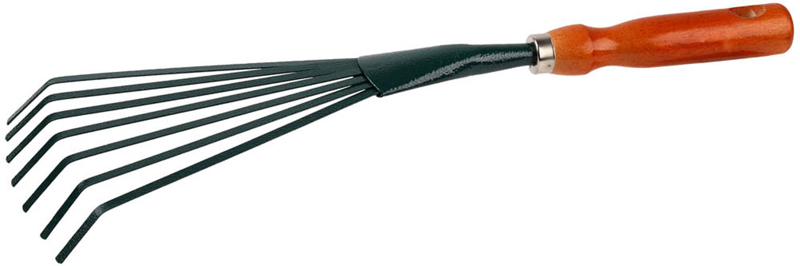 Грабельки веерные GRINDA 8-421253_z01, применяются для аэрирования почвы и сбора опавшей листвы в саду и огороде. Рабочая часть выполнена из высококачественной углеродистой стали с антикоррозионным покрытием повышенной стойкости. Зубцы имеют плоский профиль. Рукоятки изготовлены из первосортной древесины, отполированы и оснащены отверстием для удобства хранения.
